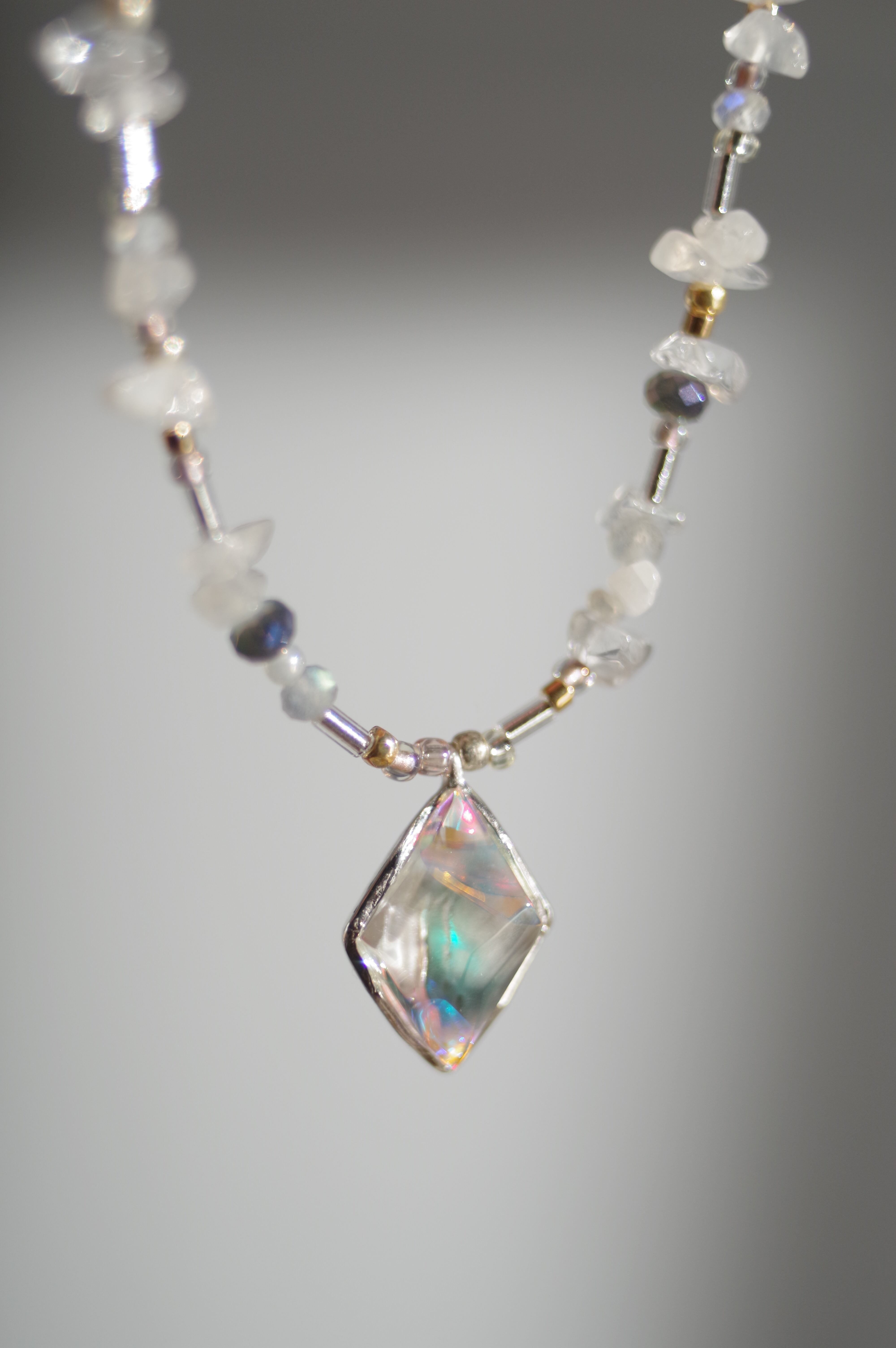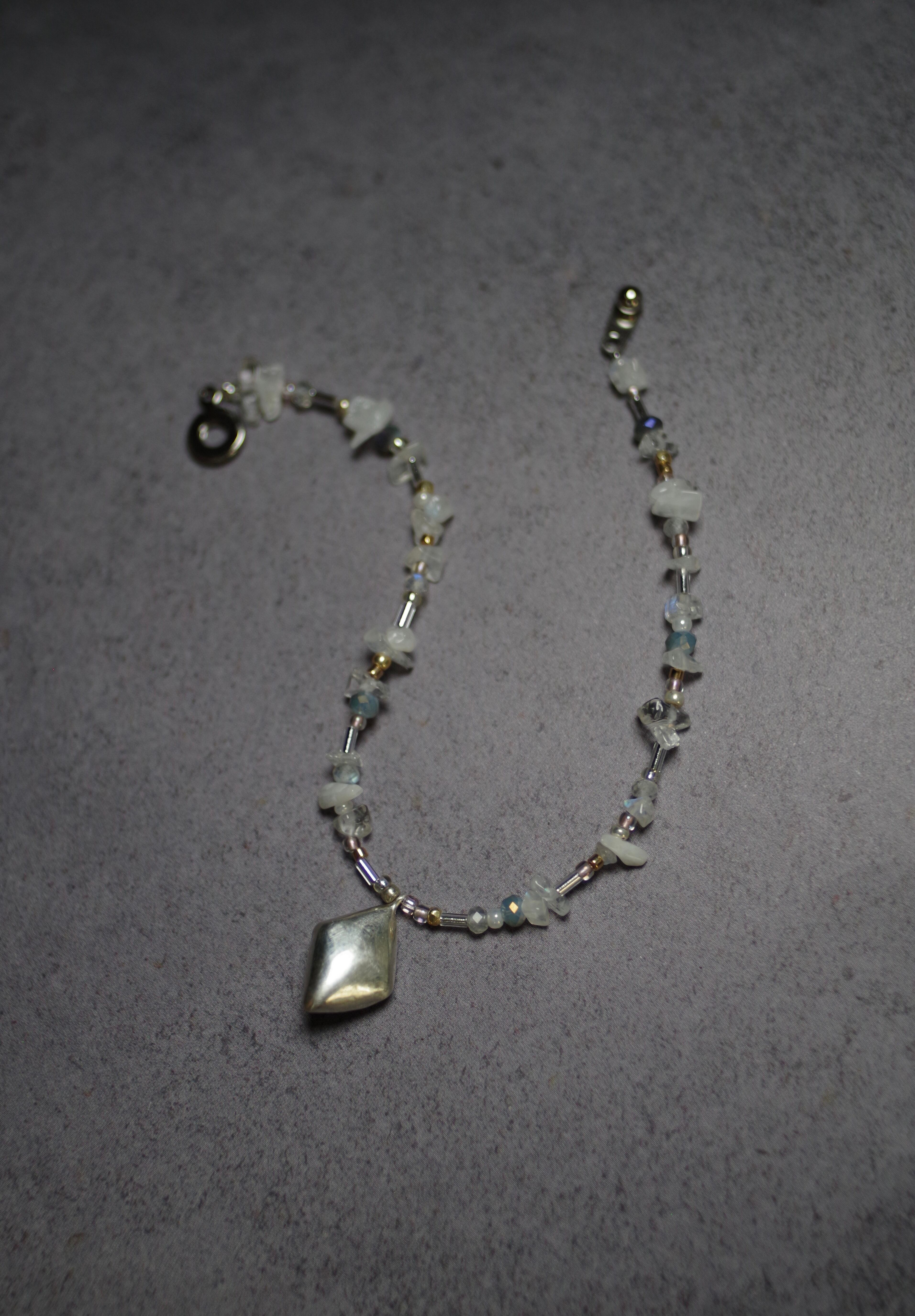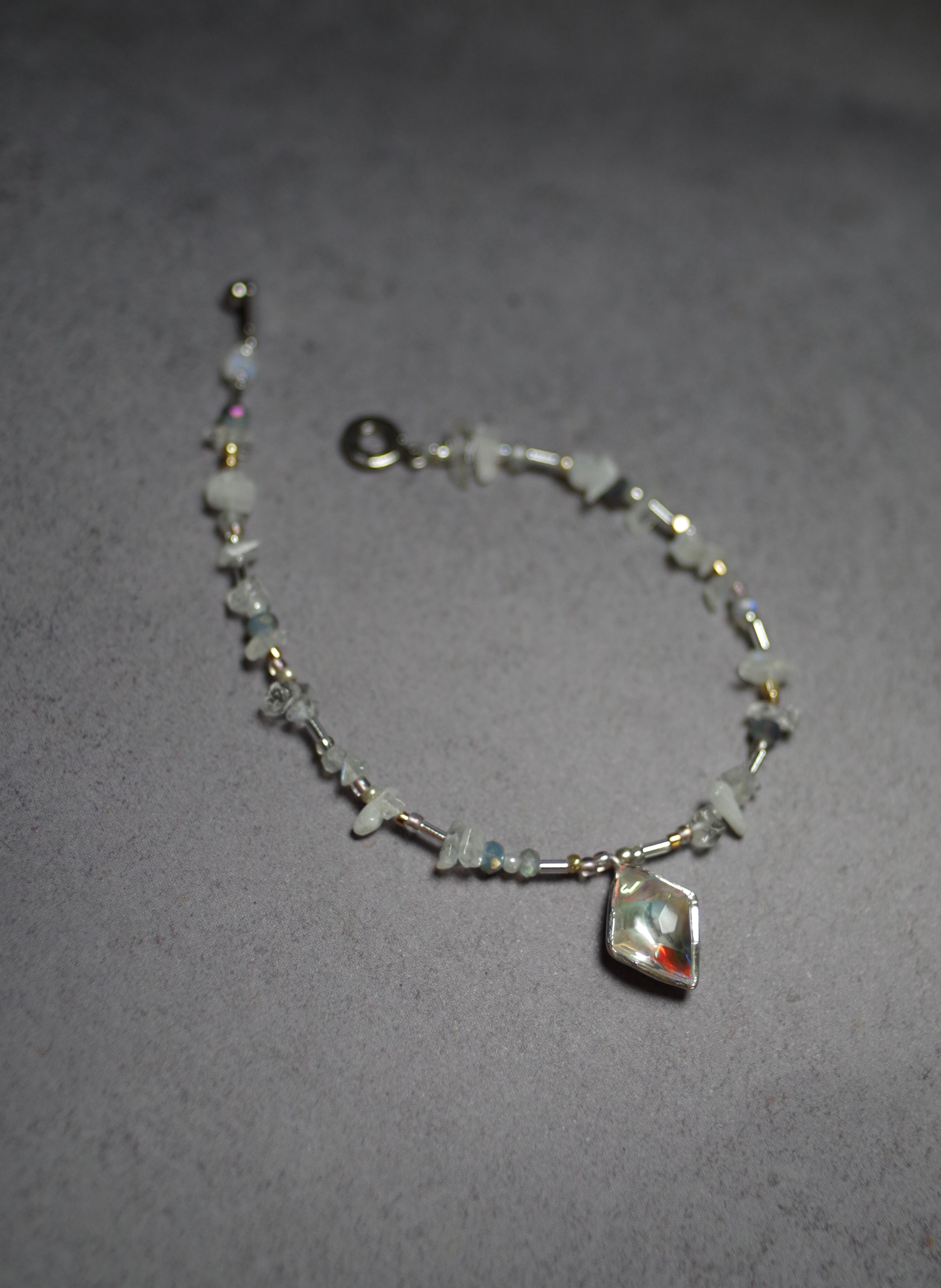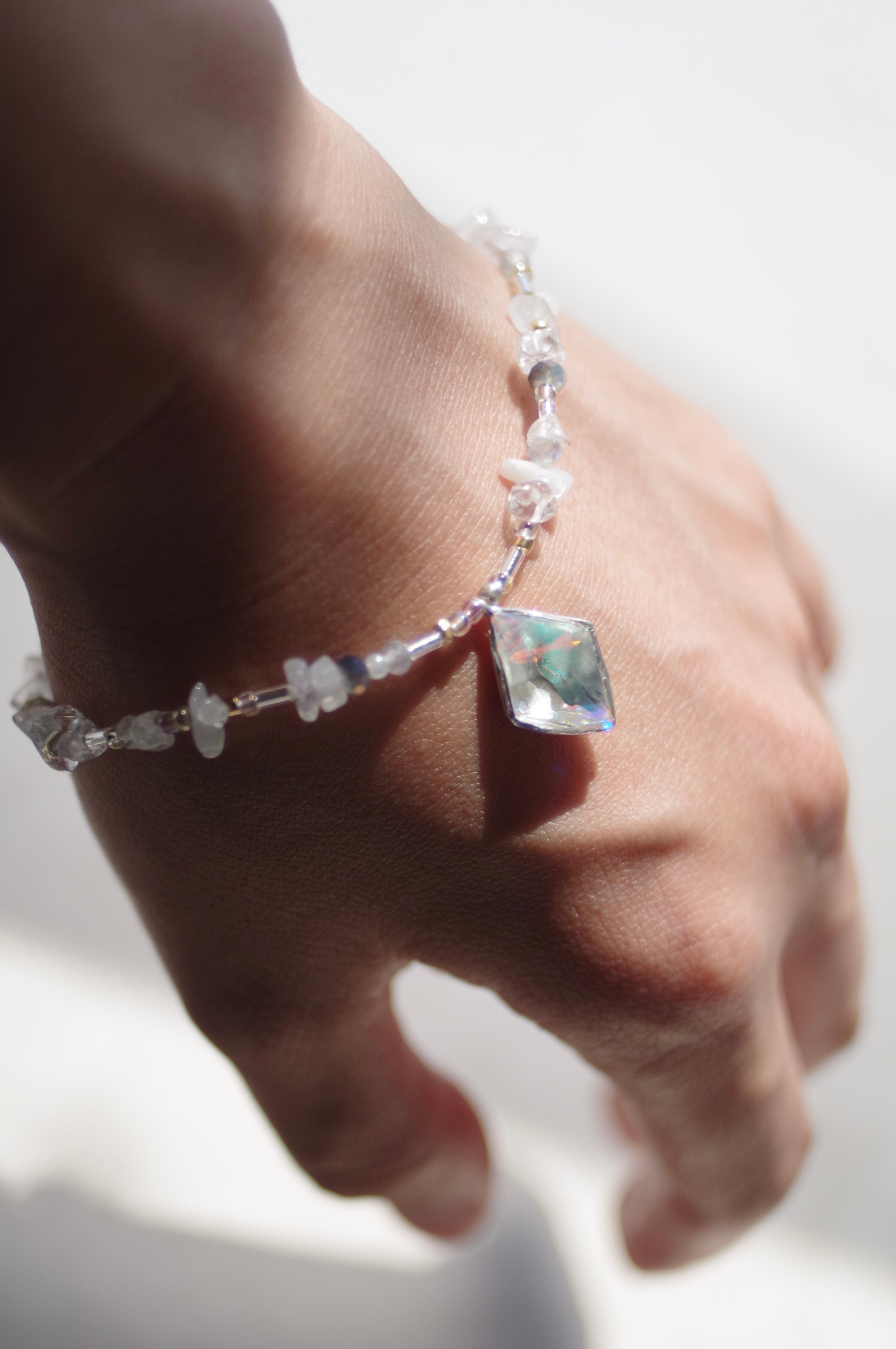 菱形のダイクロガラスが光をまとい、ムーンストーンやラブラドライトの天然石が周りを彩るガラスのブレスレット 素材 ダイクロガラス•silver925(トップ部分のみ) •天然ホワイトムーンストーン•天然ラブラドライト•ガラスビーズ•樹脂パール•メッキ•テグス テグスの長さ(マンテル部分を除く)約38cm
