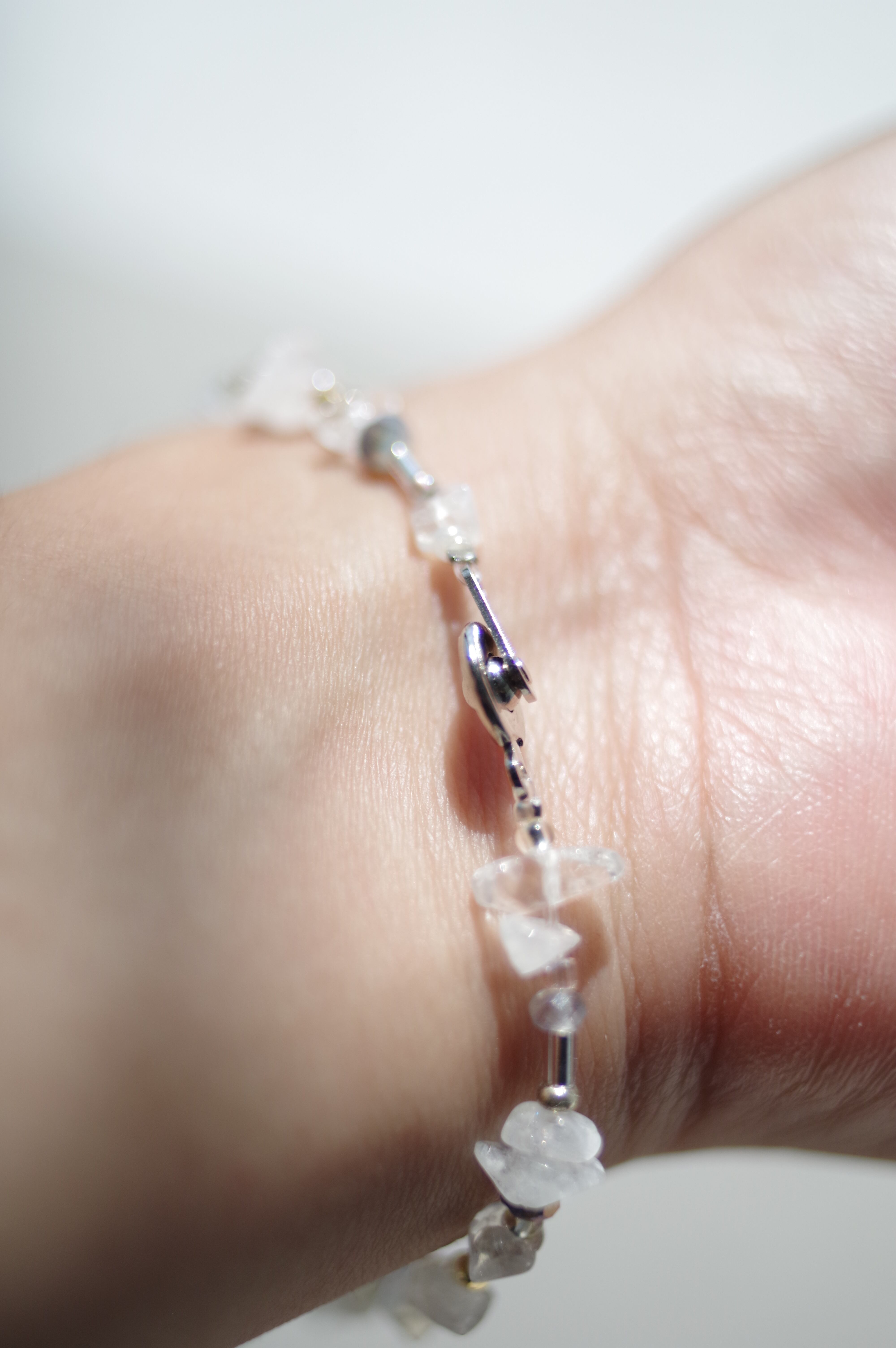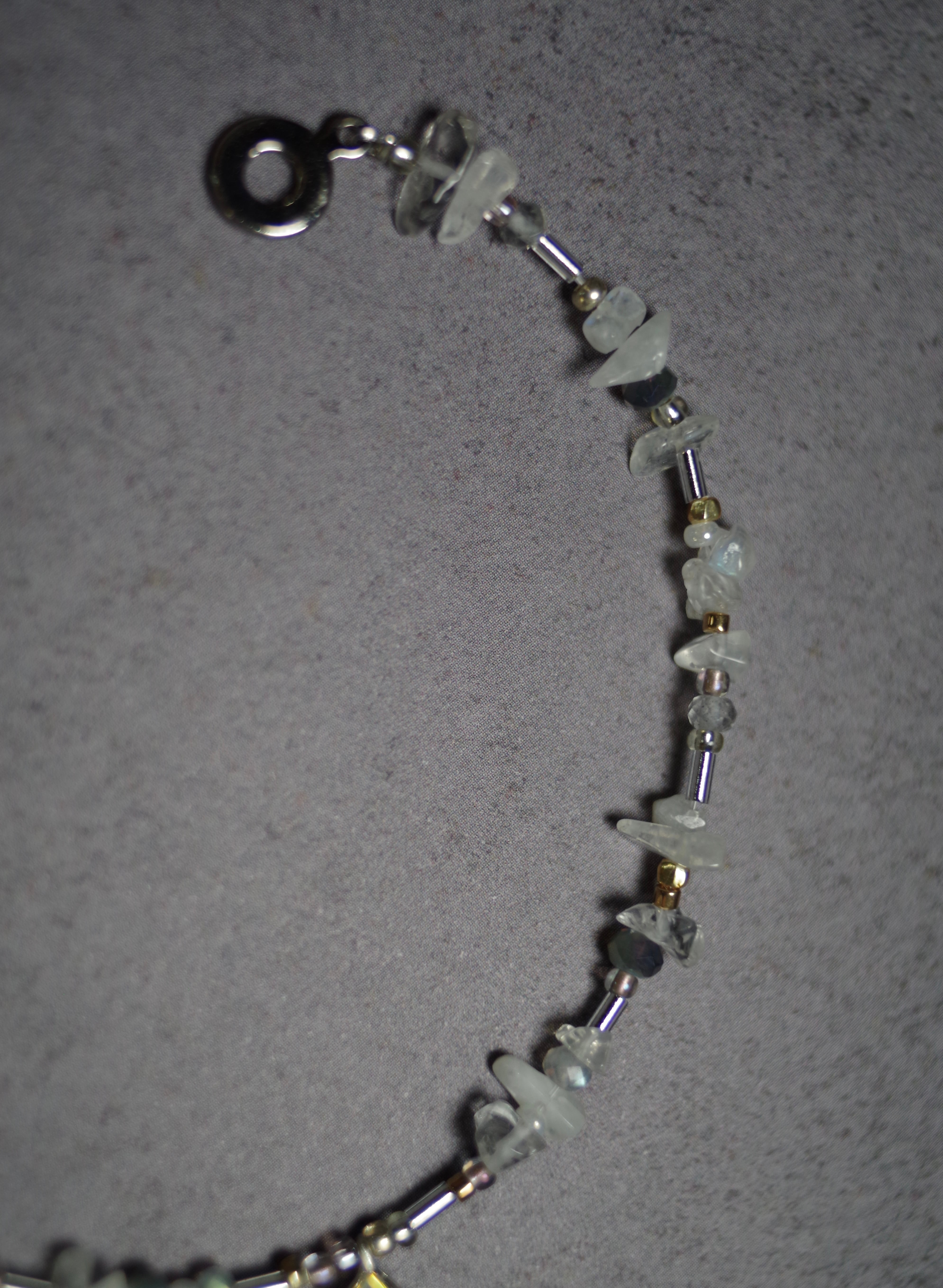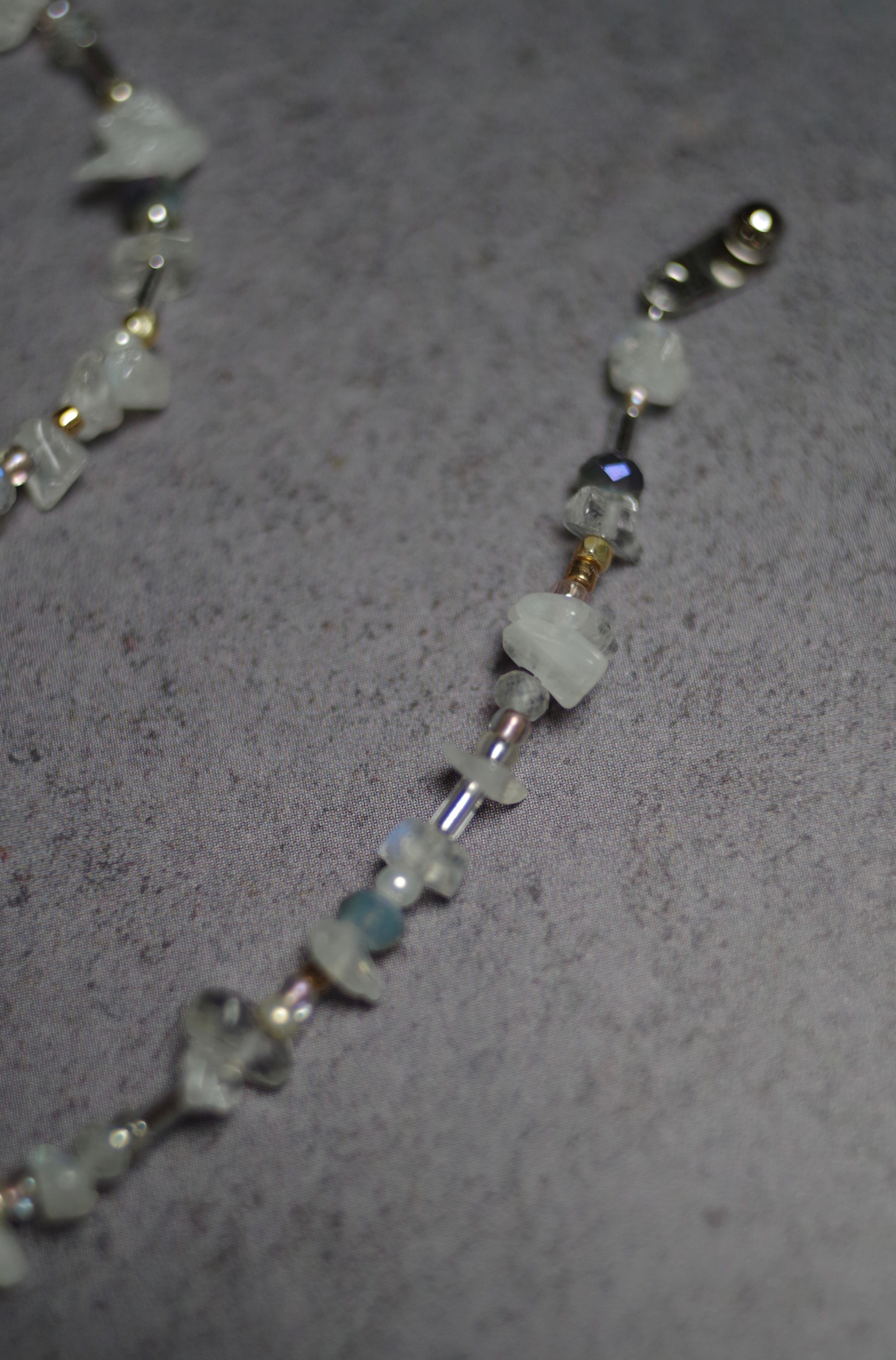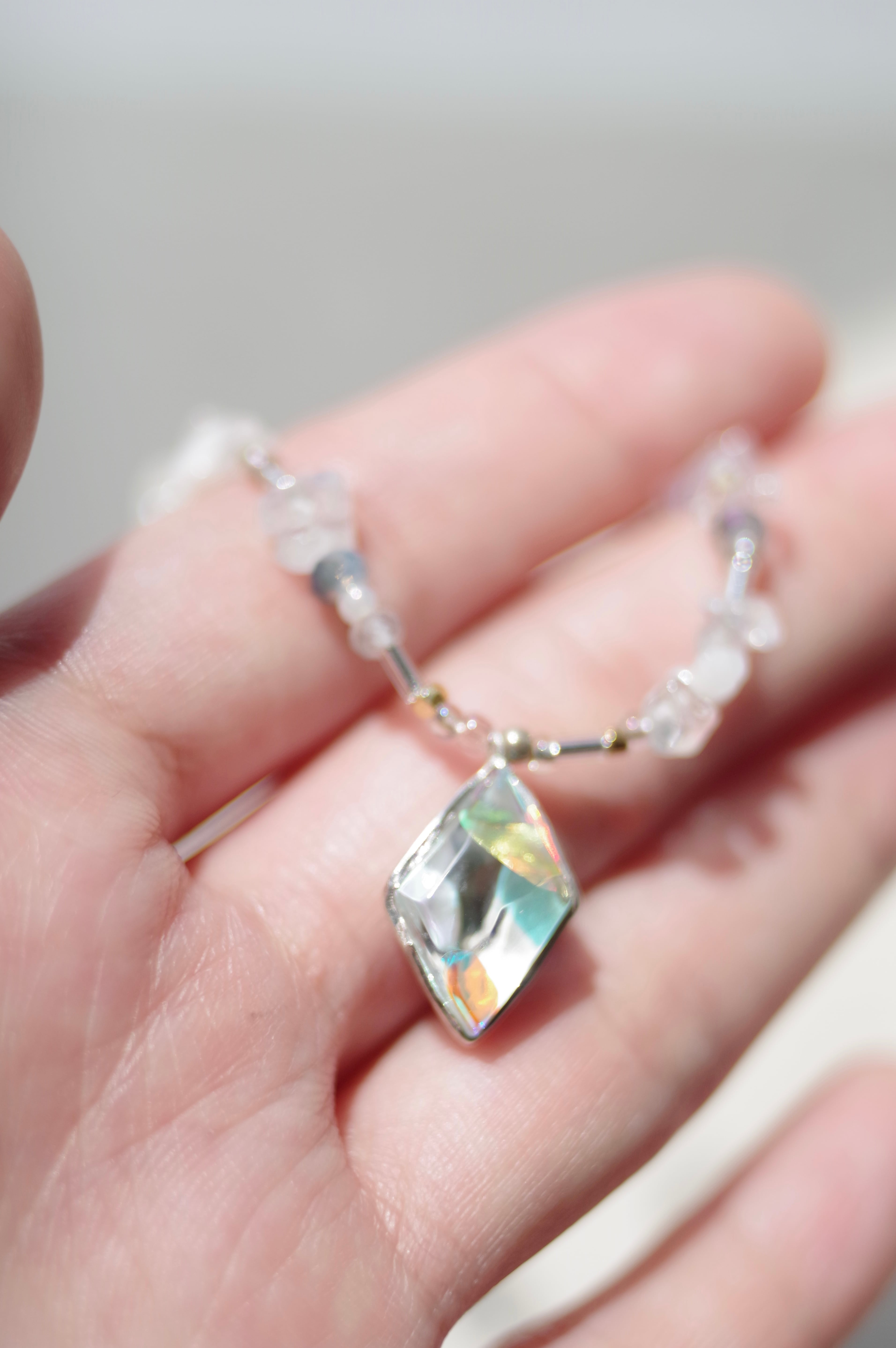 菱形のダイクロガラスが光をまとい、ムーンストーンやラブラドライトの天然石が周りを彩るガラスのブレスレット 素材 ダイクロガラス•silver925(トップ部分のみ) •天然ホワイトムーンストーン•天然ラブラドライト•ガラスビーズ•樹脂パール•メッキ•テグス テグスの長さ(マンテル部分を除く)約38cm