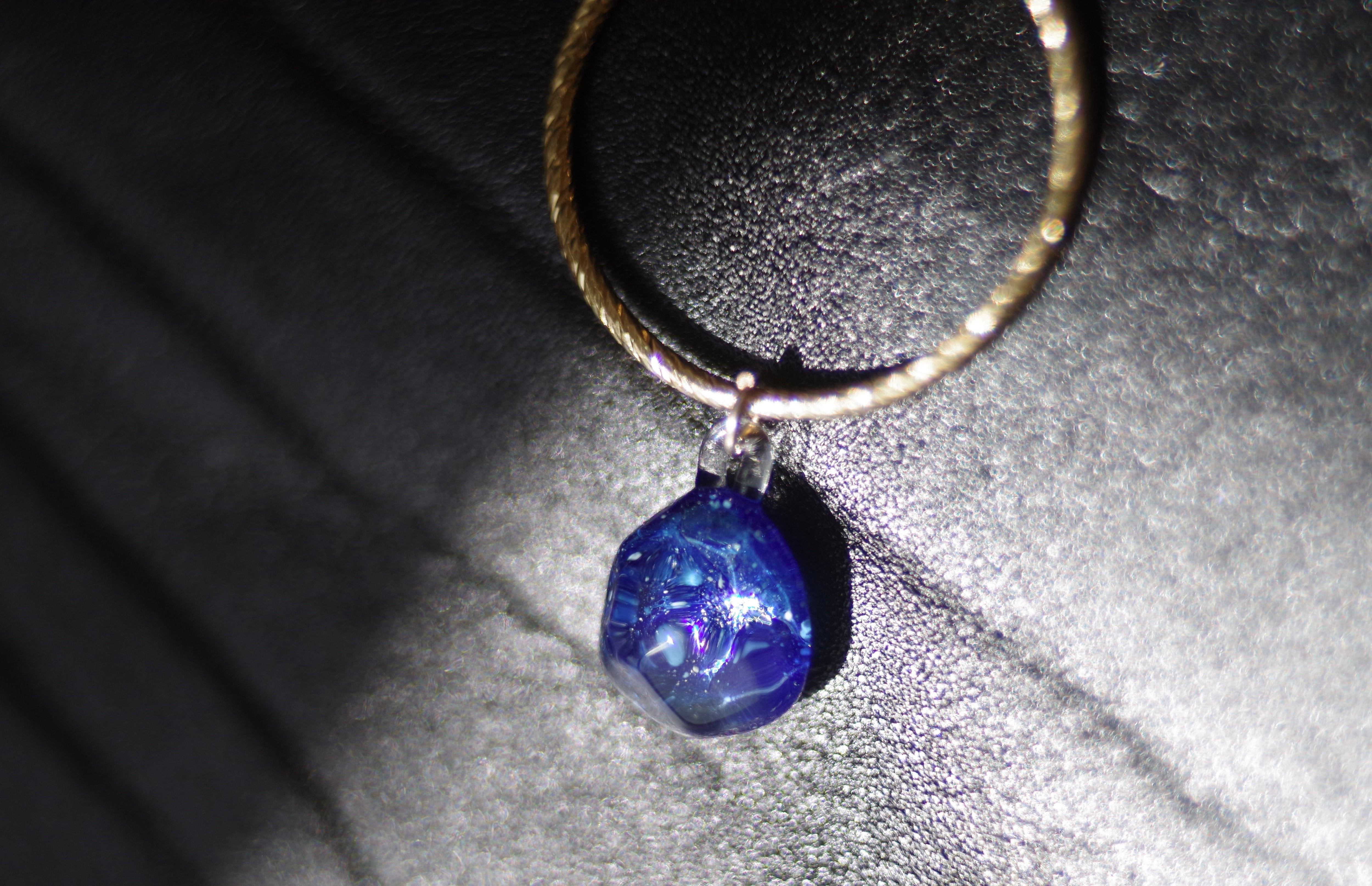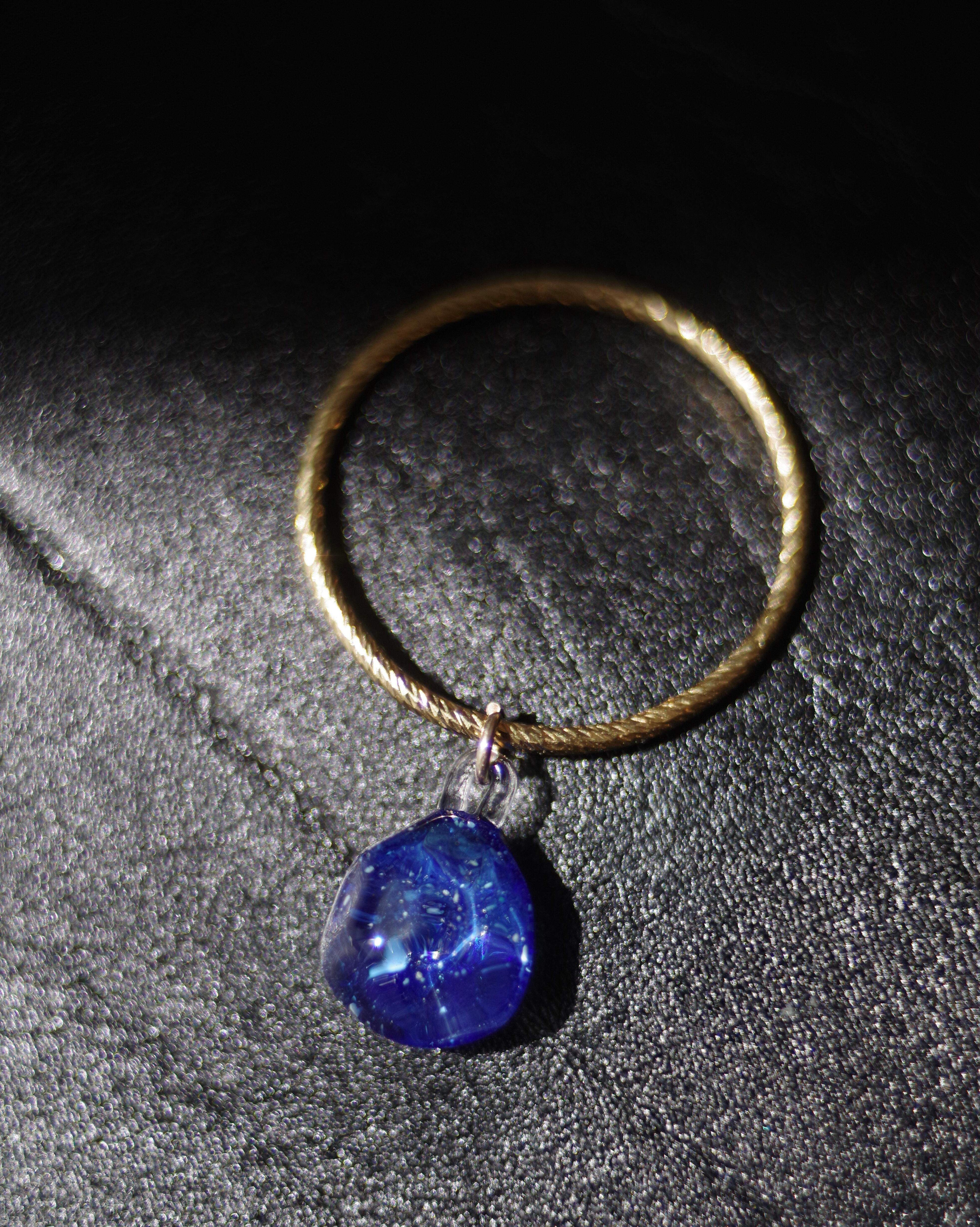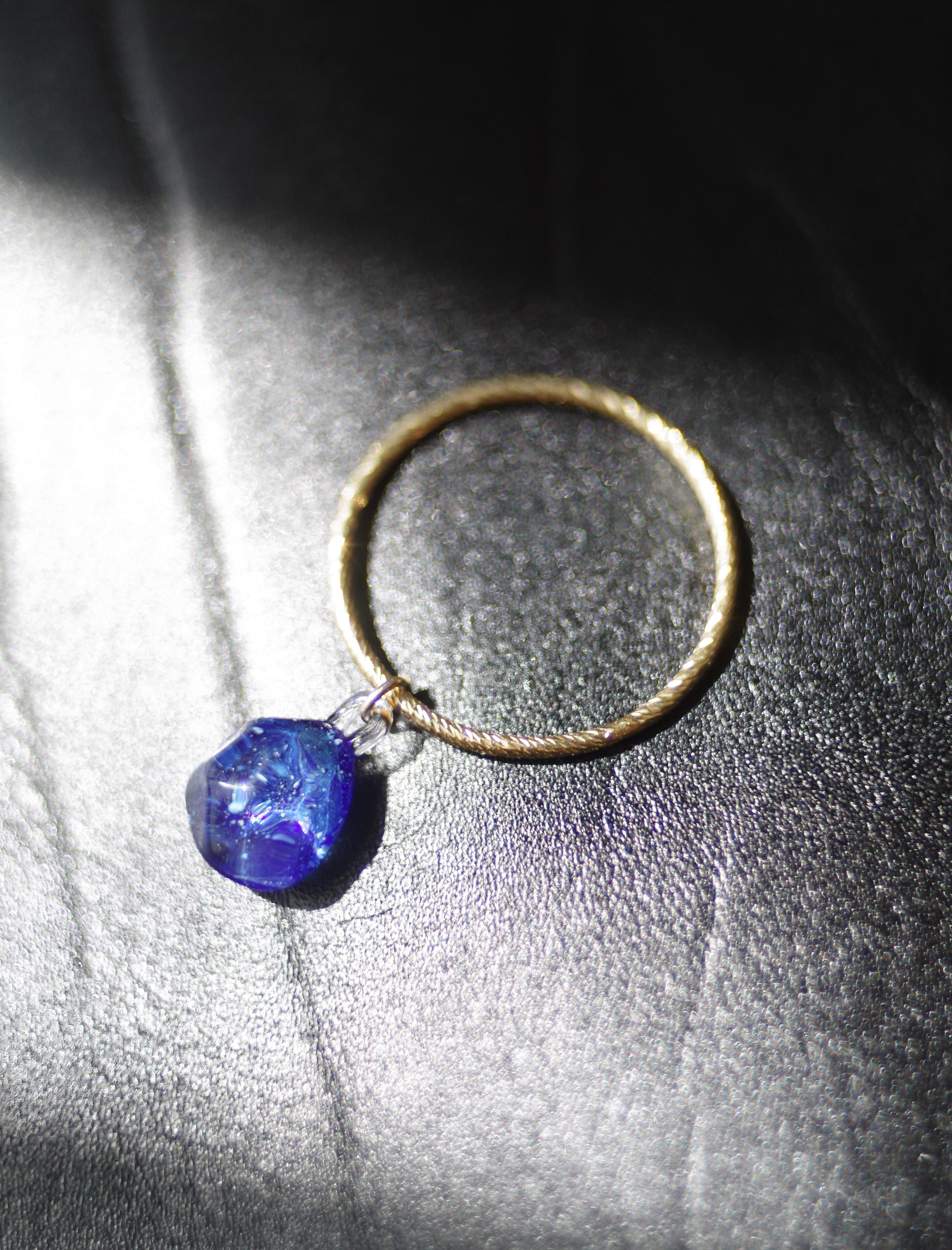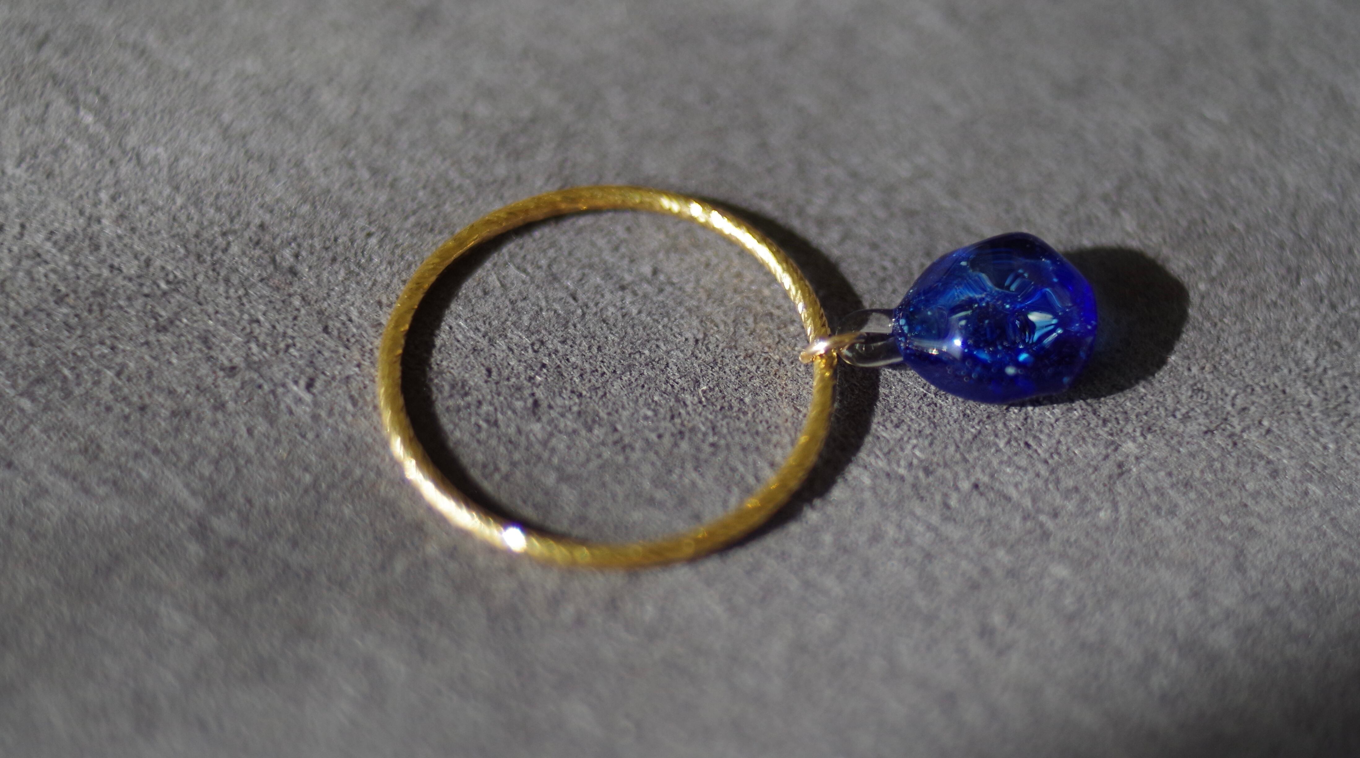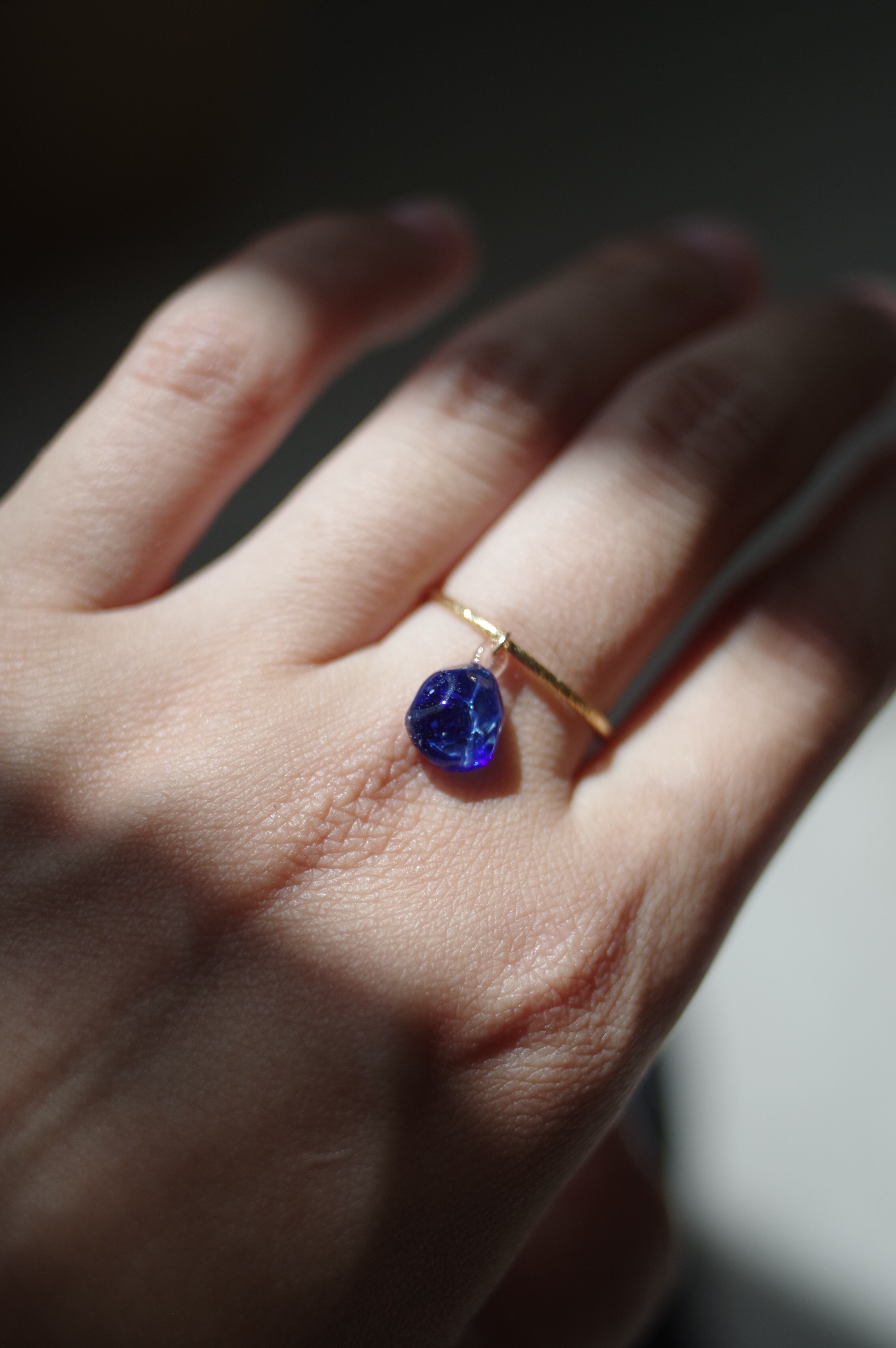 細い金色のリングの下に浮遊する青い石 12.5号 素材 ボロシリケイトガラス 14KGF ガラス石の大きさ 約8mm×7mm×5mm リング幅 約0.9mm