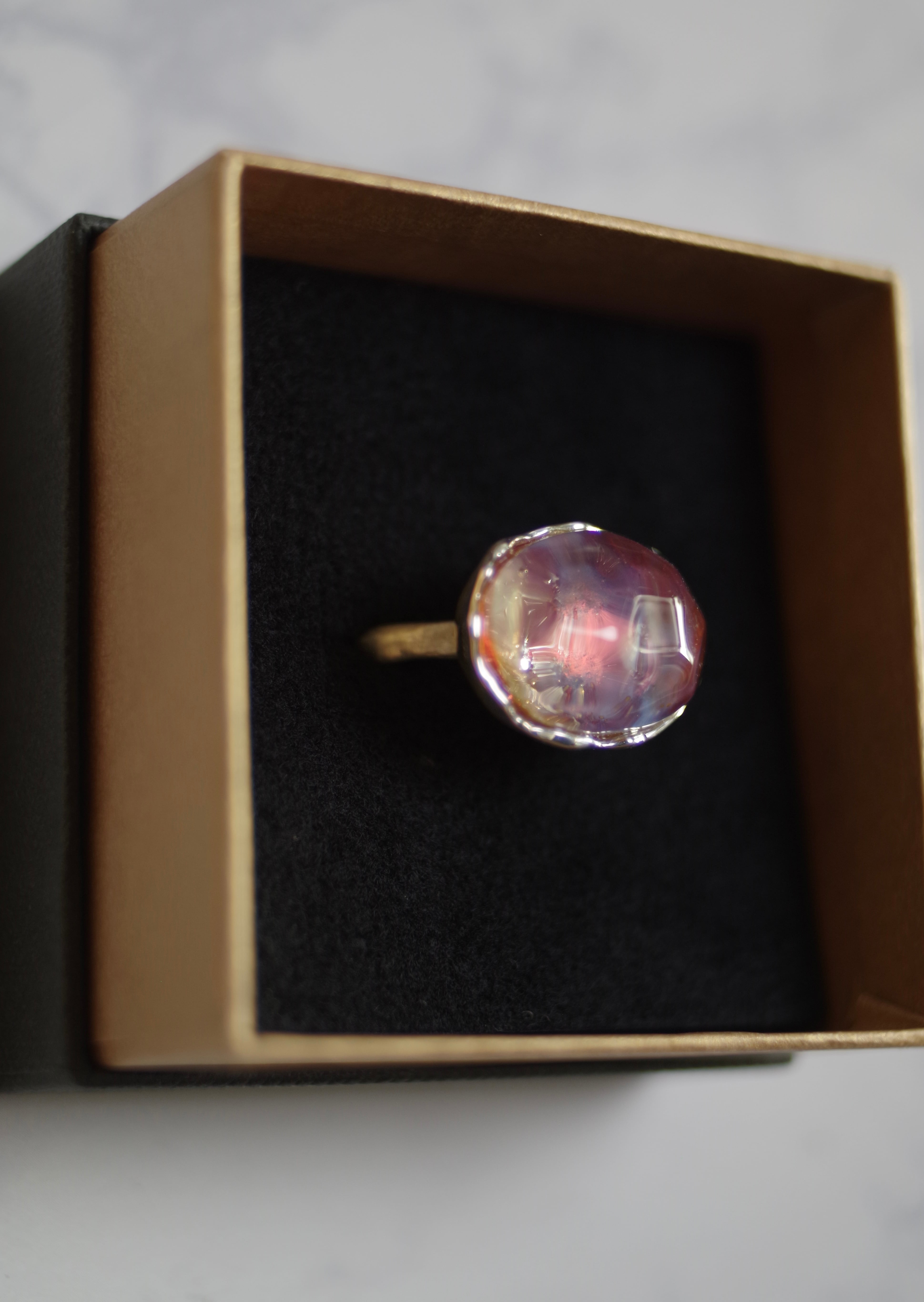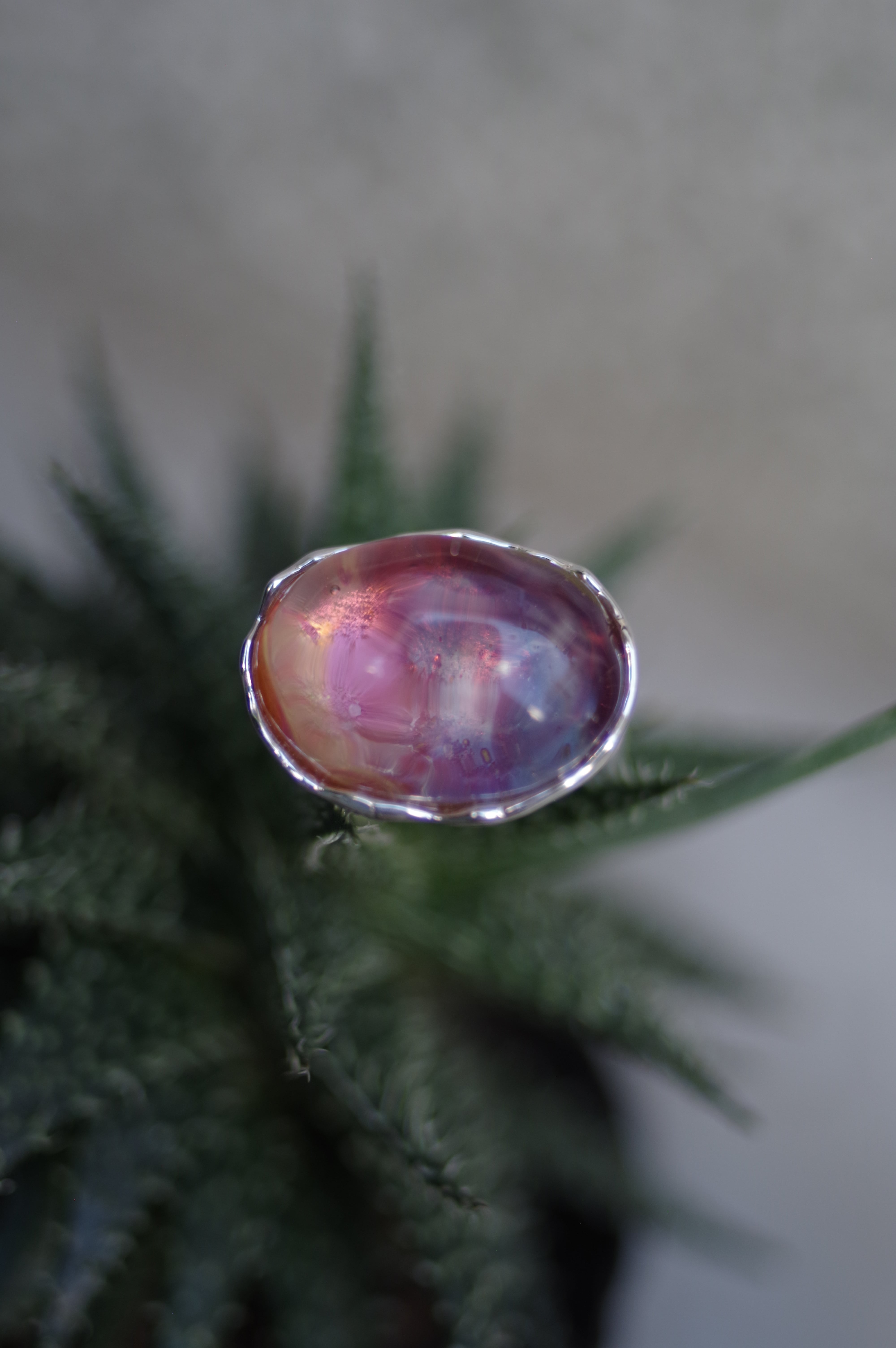 黄色から淡い紅色、熟したような暗紫へ 7.5号〜フリーサイズ(こちらで大きくすることは可能です、ご注文の際に希望のサイズをお知らせください) 素材 ボロシリケイトガラス silver925 ガラス石の大きさ 約15mm×21mm×11mm リング幅 約2.8mm