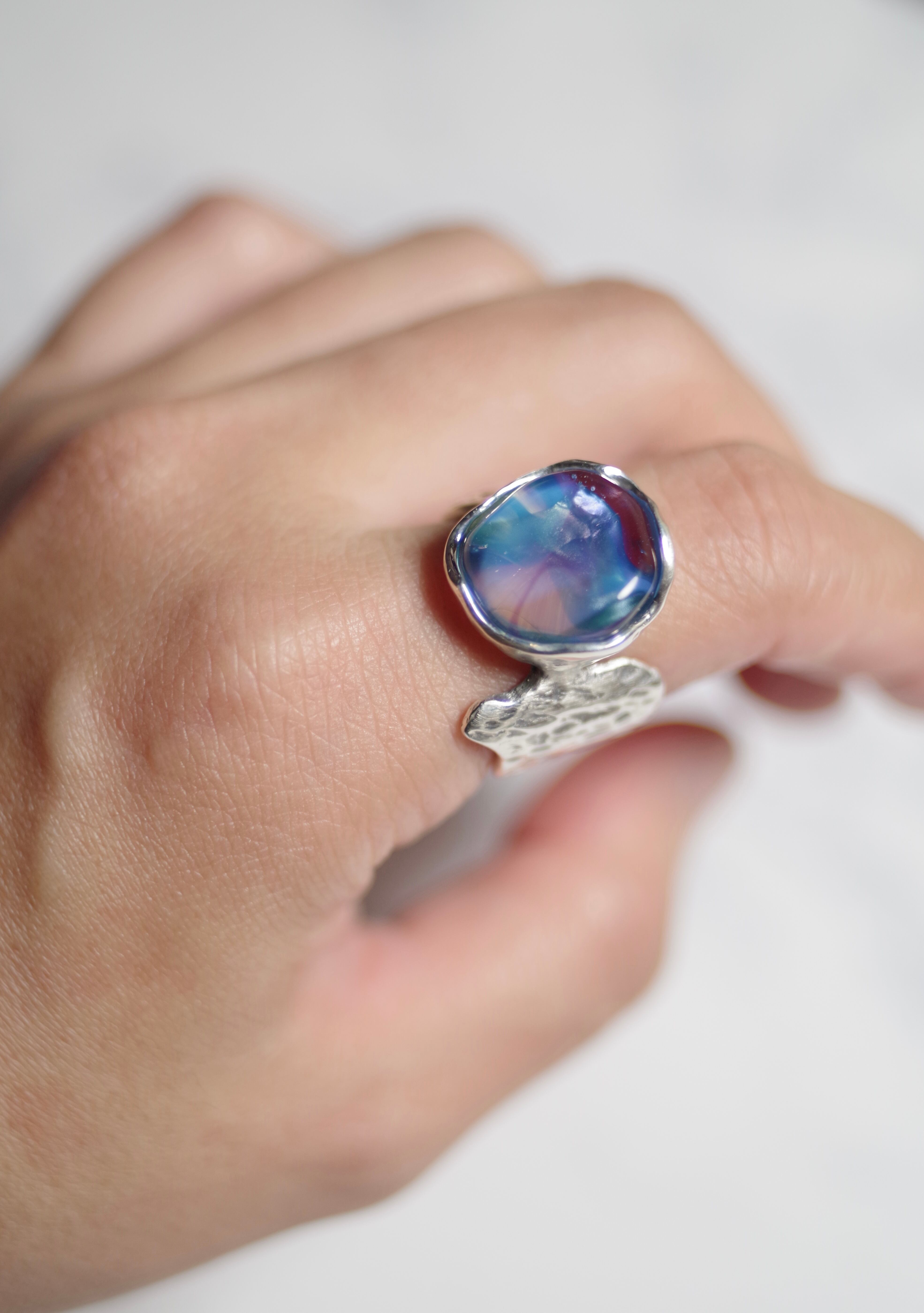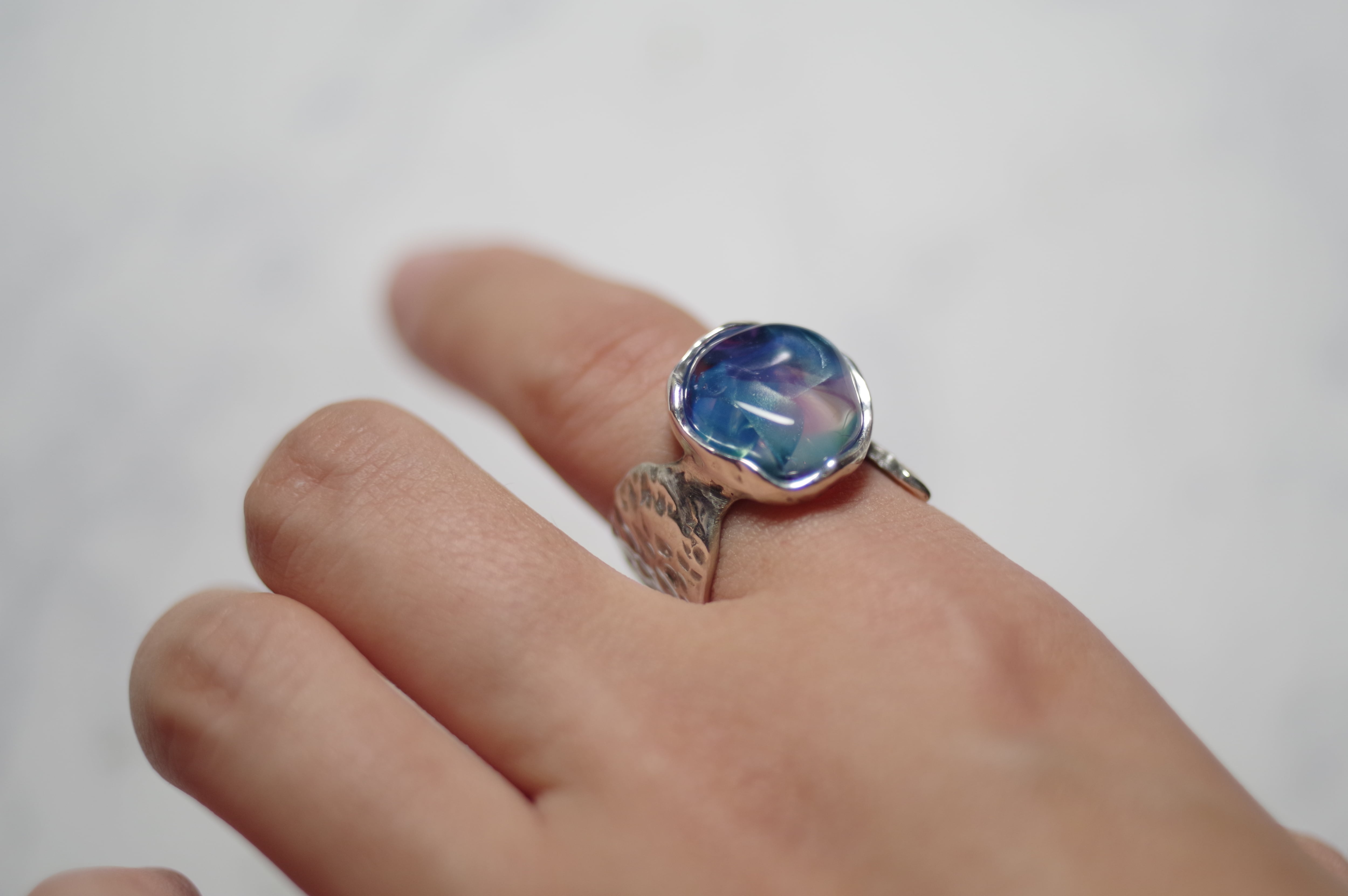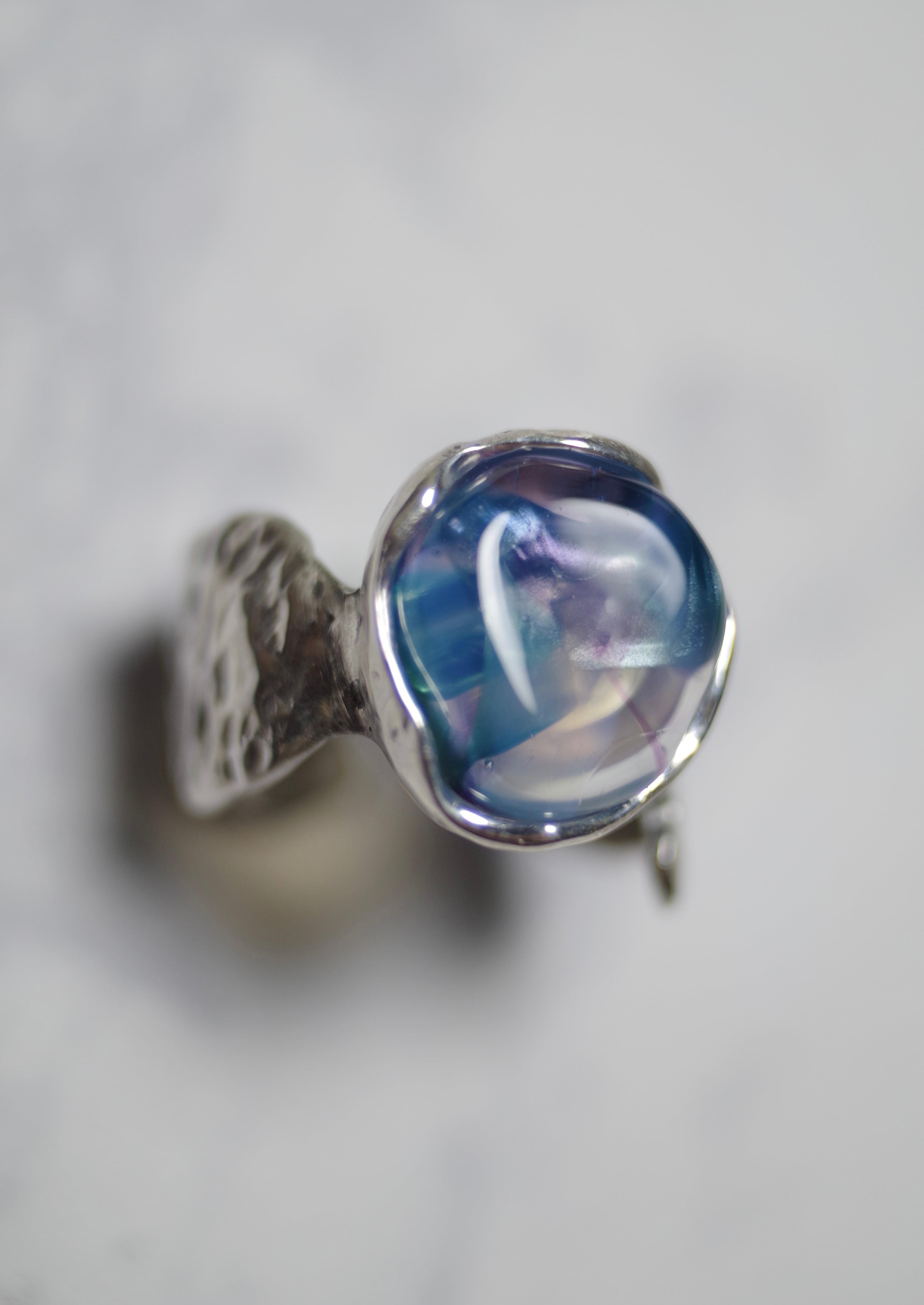 自由な翼 13号〜フリーサイズ(こちらで大きくすることは可能です、ご注文の際に希望のサイズをお知らせください) 素材 ボロシリケイトガラス silver925 ガラス石の大きさ 約14mm×14mm×6mm リング幅 約14mm