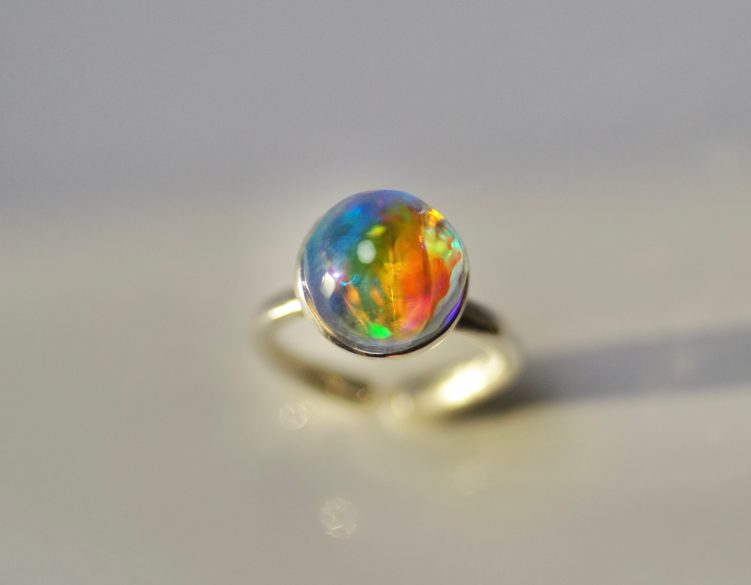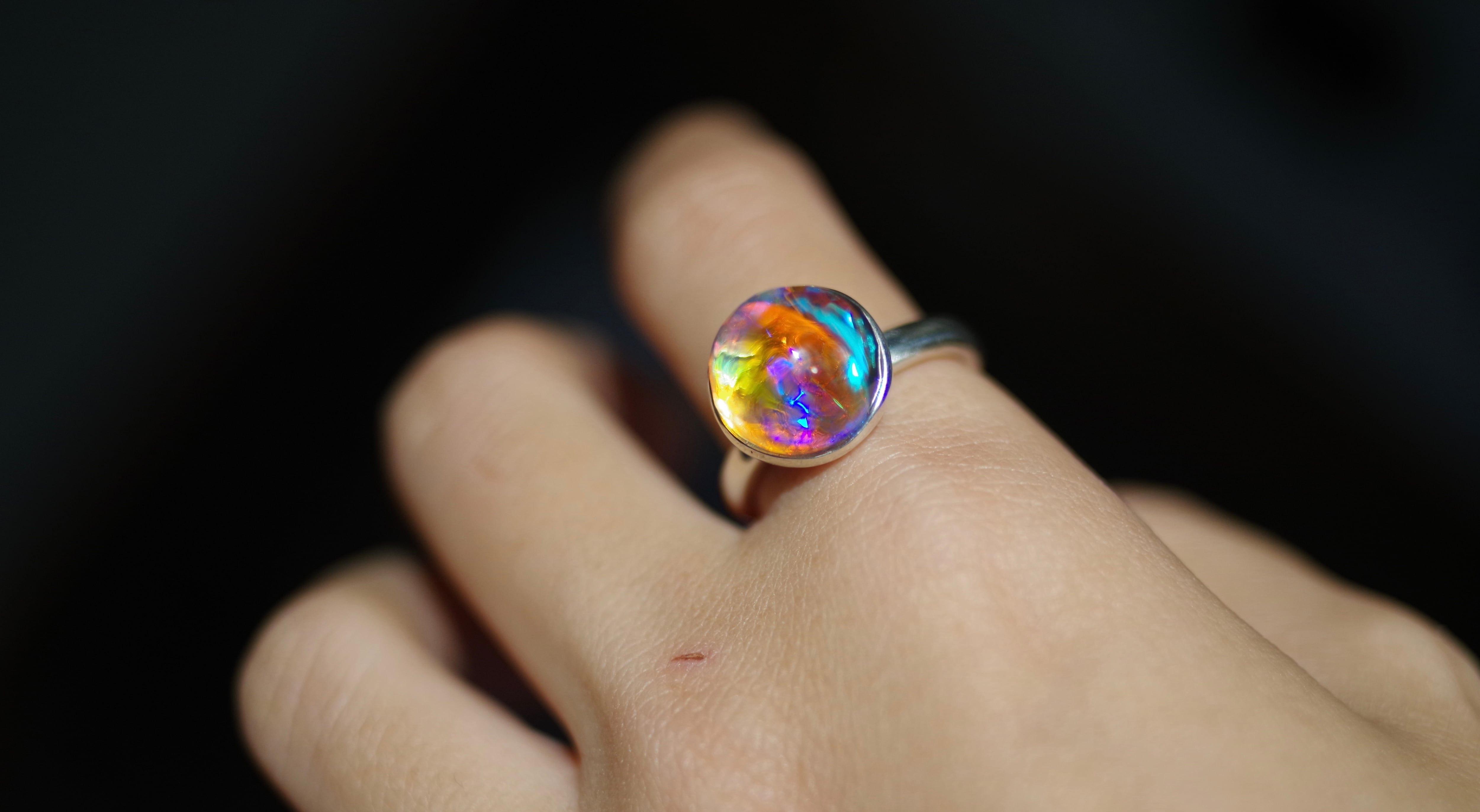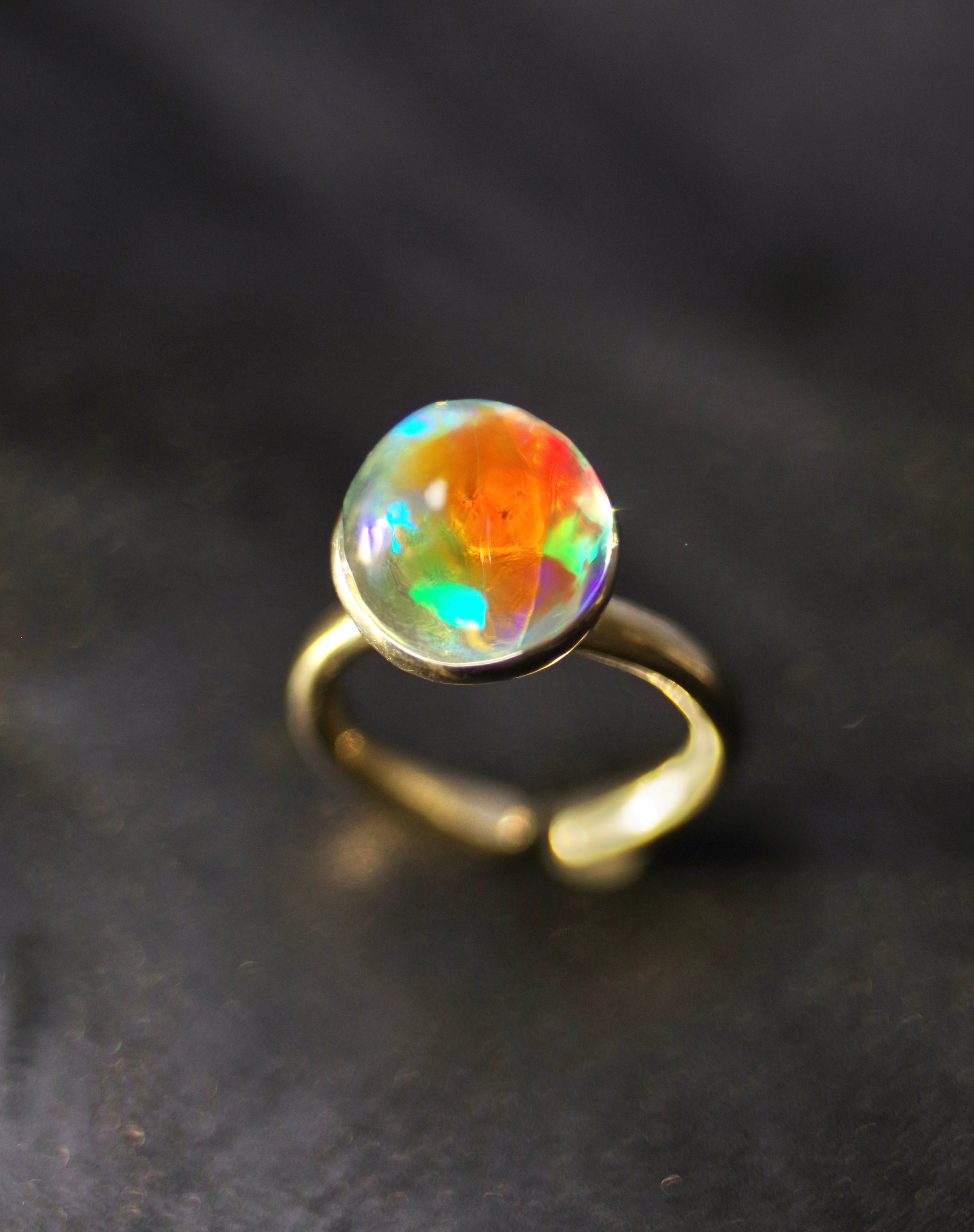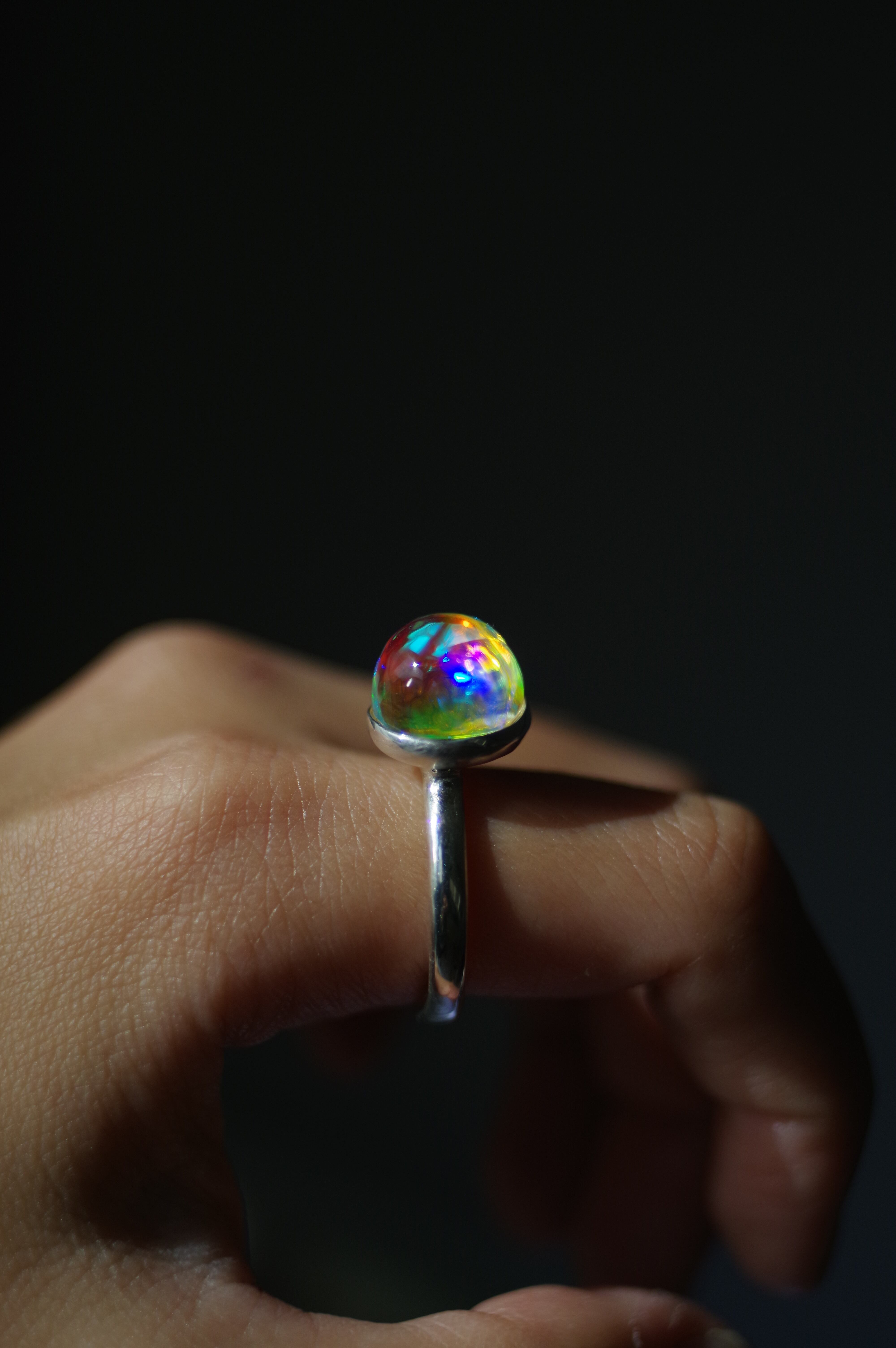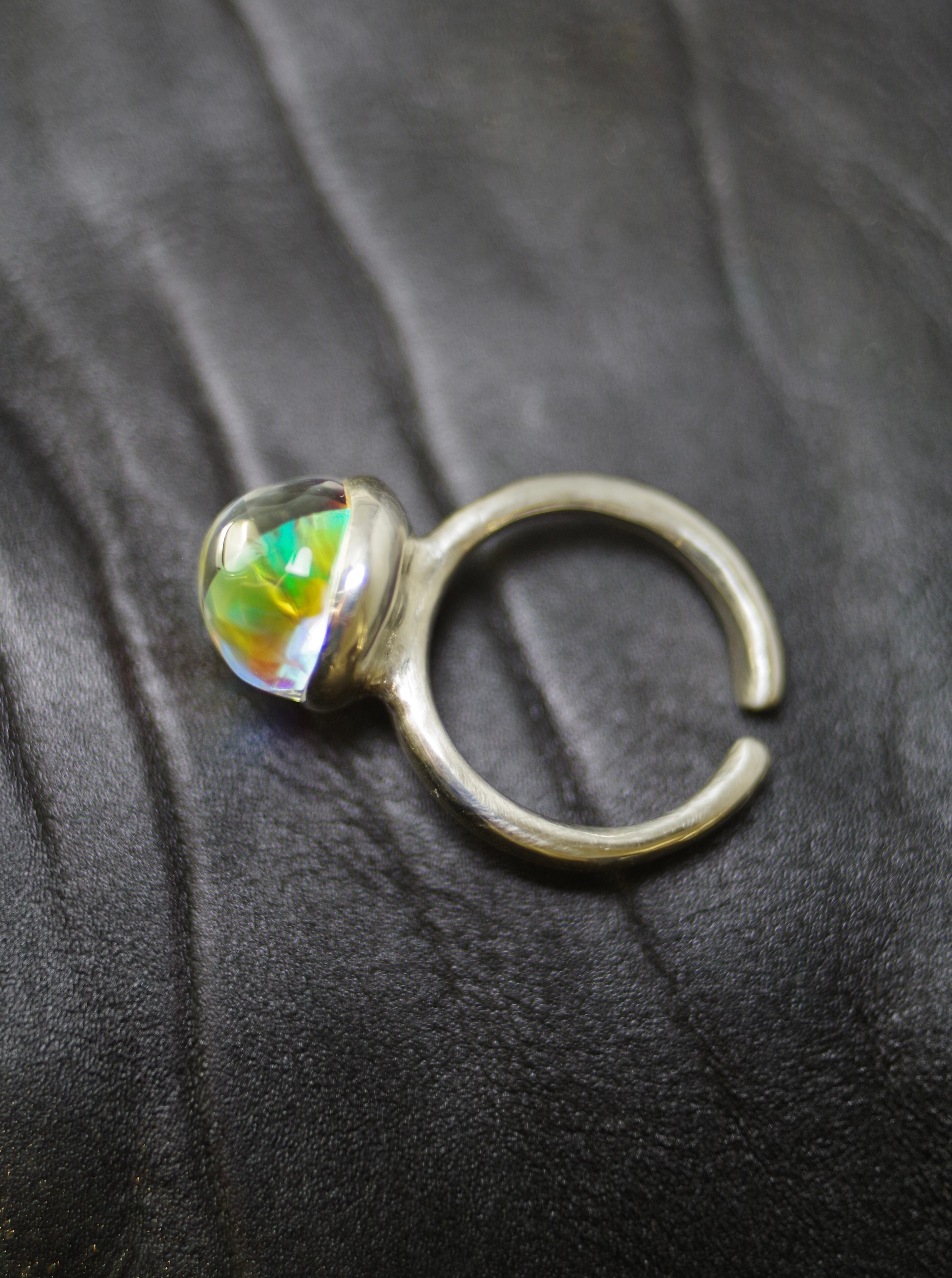 次々に変化する色彩 10.5号〜フリーサイズ(ご希望のサイズをお知らせください) 素材 ダイクロガラス silver925 ガラス石の大きさ 約11mm×12mm×11mm リング幅 約2.8mm