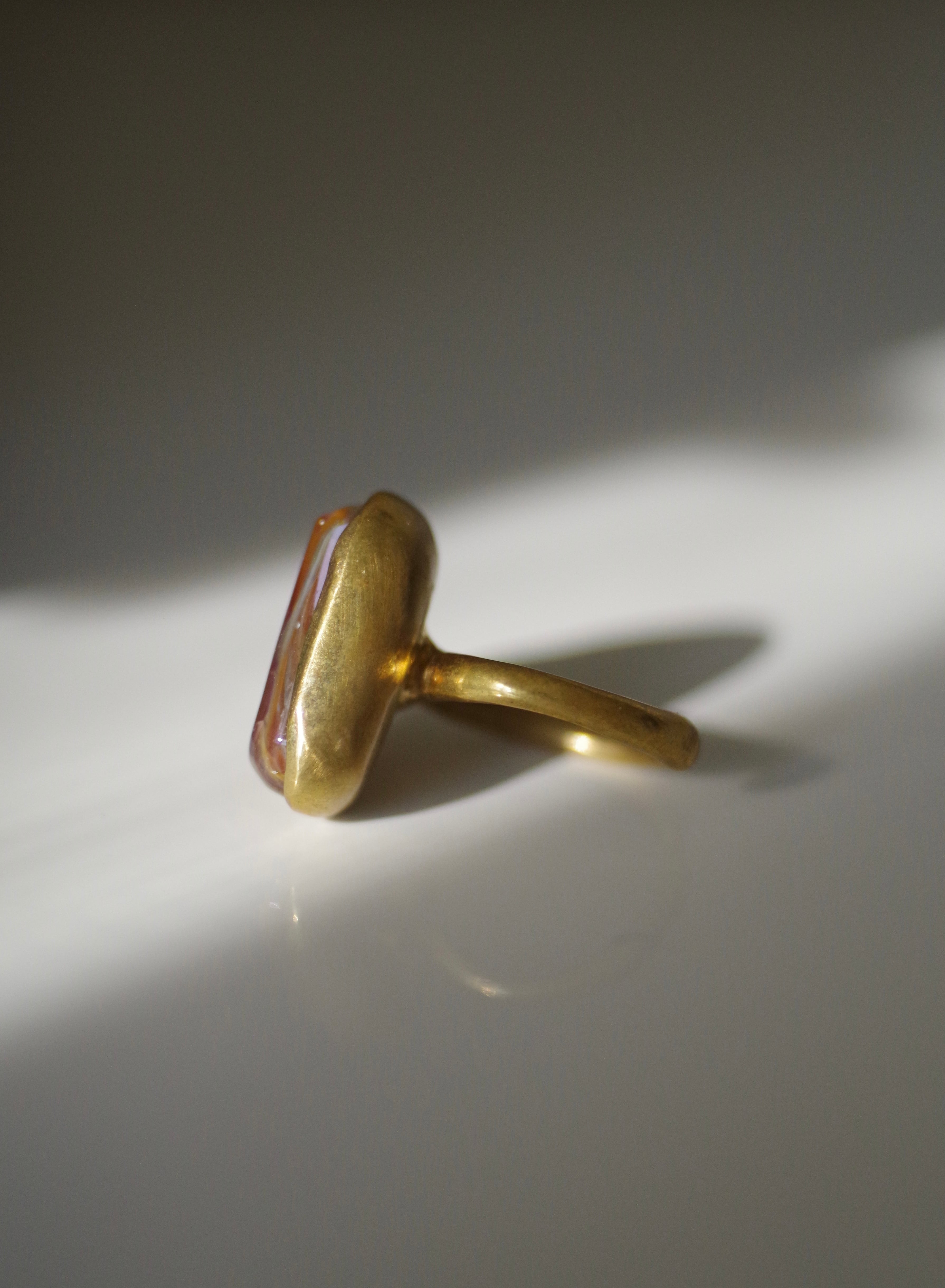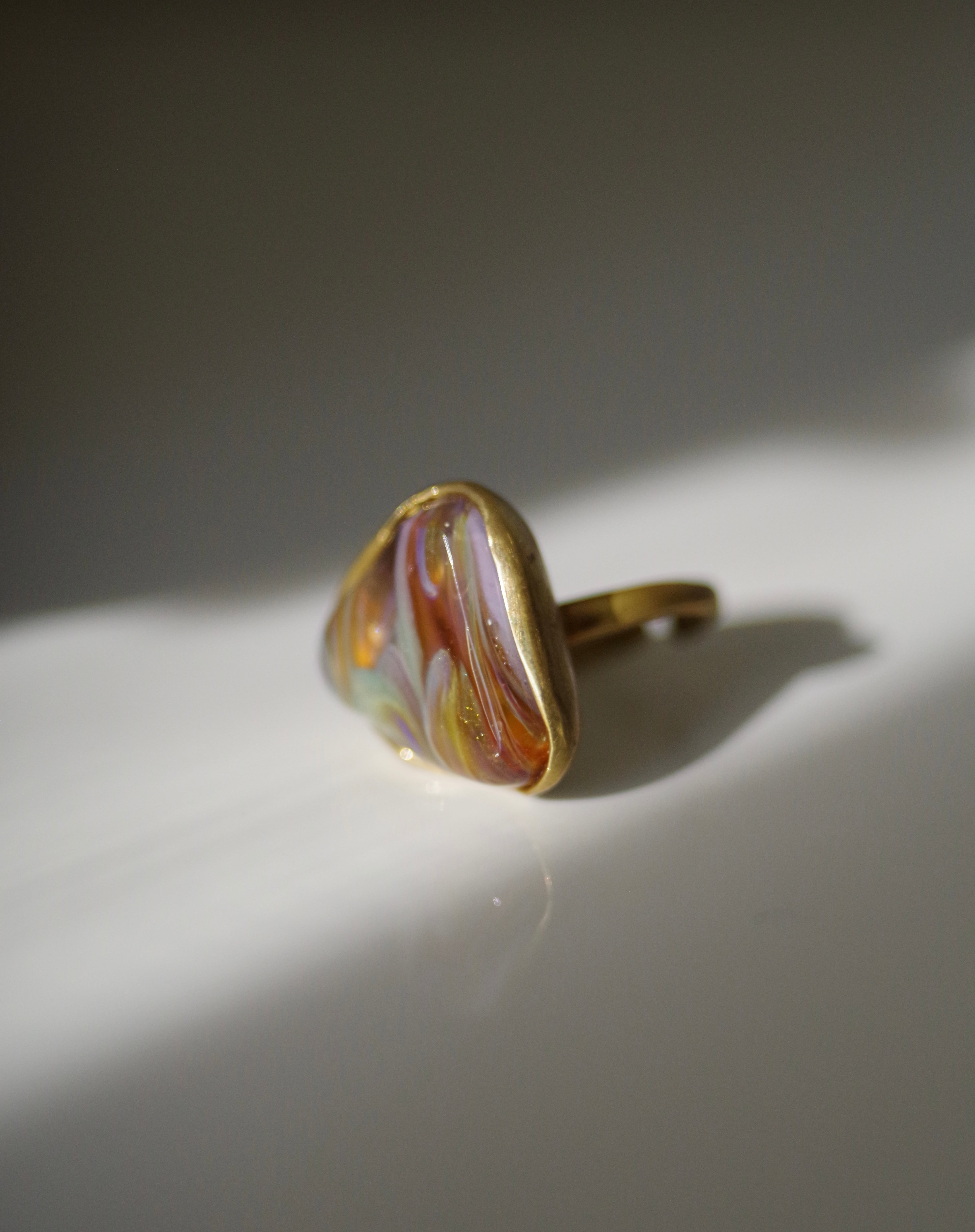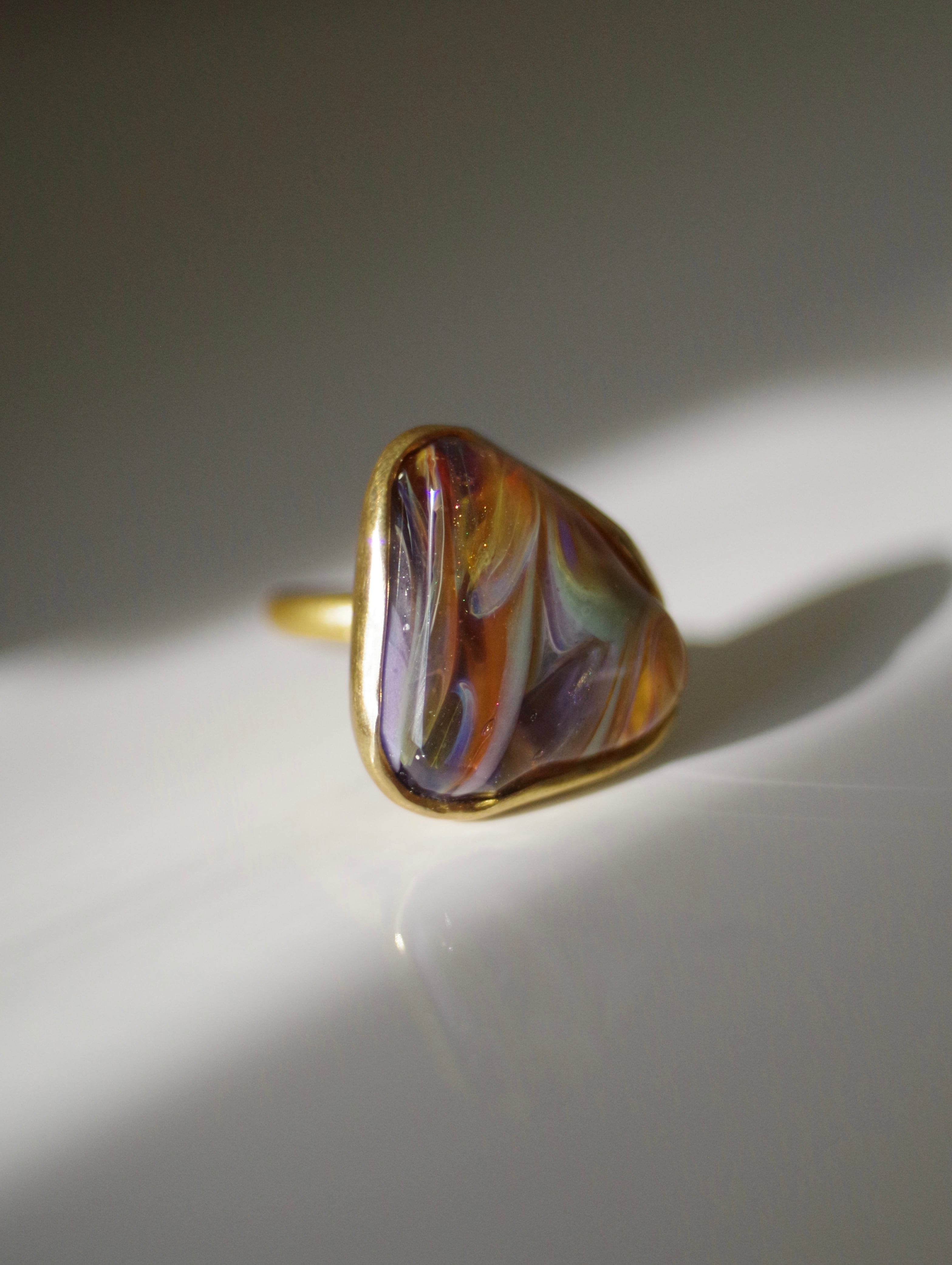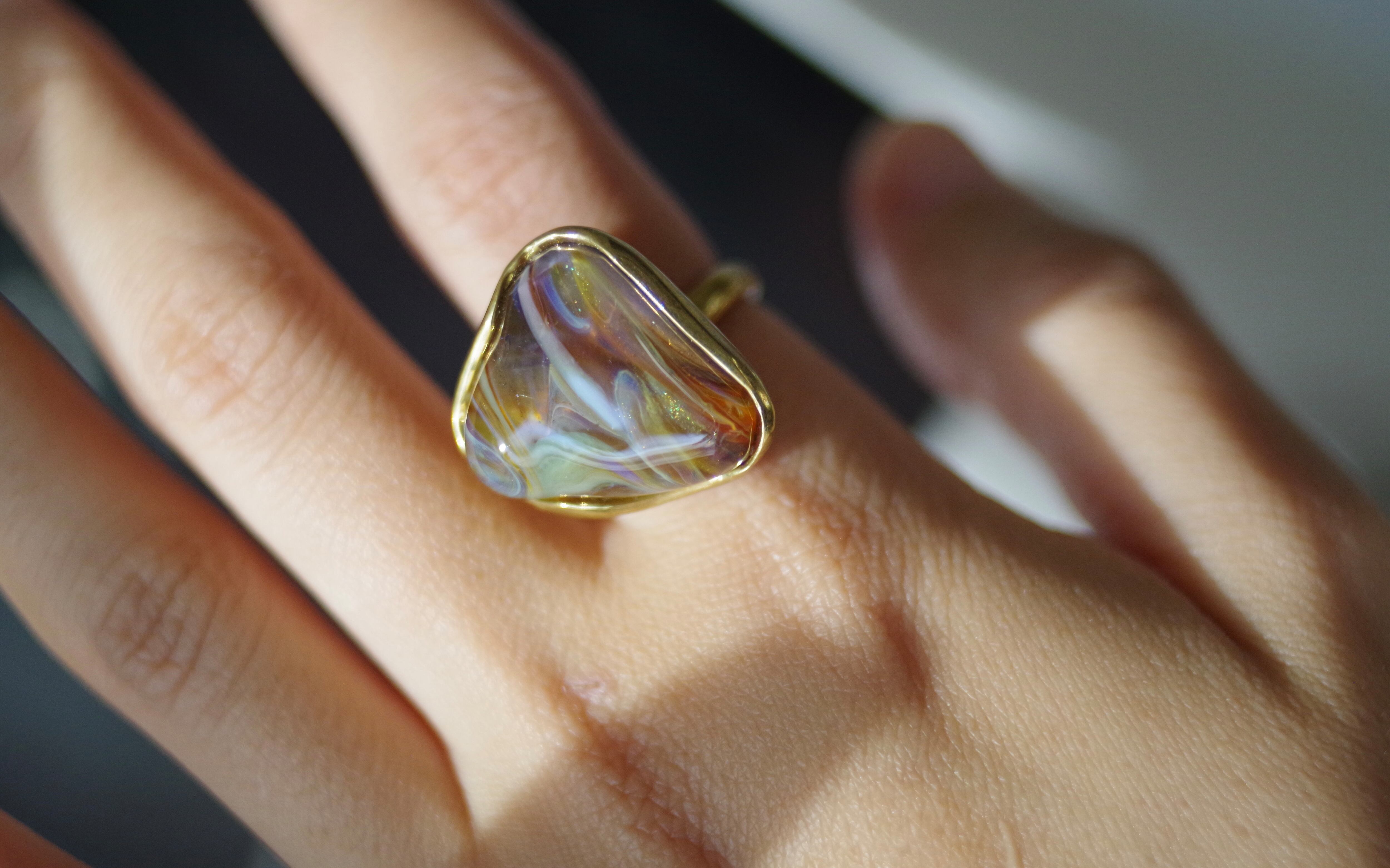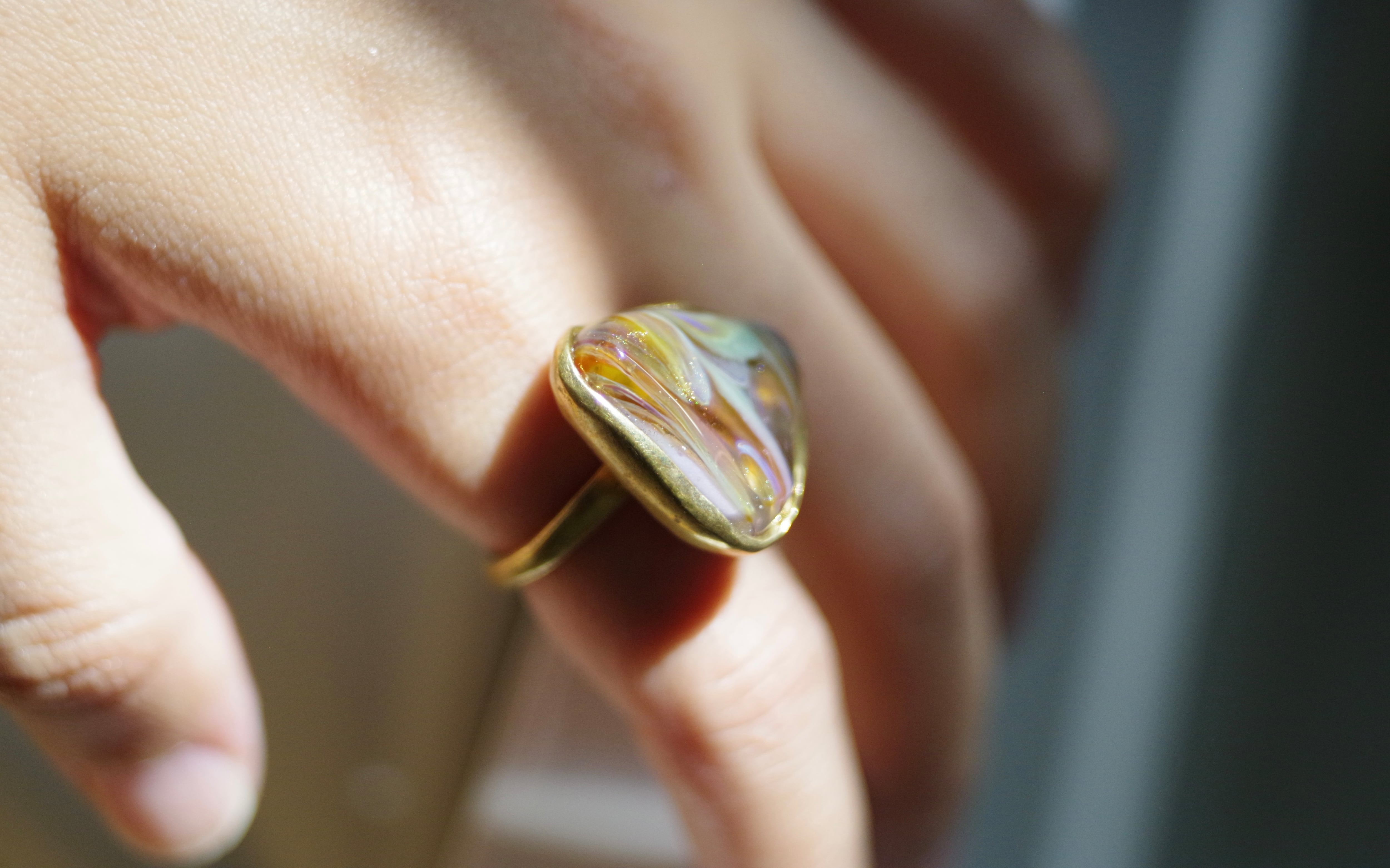 自分の色を好きなように塗りたくる 7.5号〜フリーサイズ(こちらで大きくすることは可能です、ご注文の際に希望のサイズをお知らせください) 素材 ボロシリケイトガラス 真鍮 ガラス石の大きさ 約19mm×18mm×8mm リング幅 約2.8mm