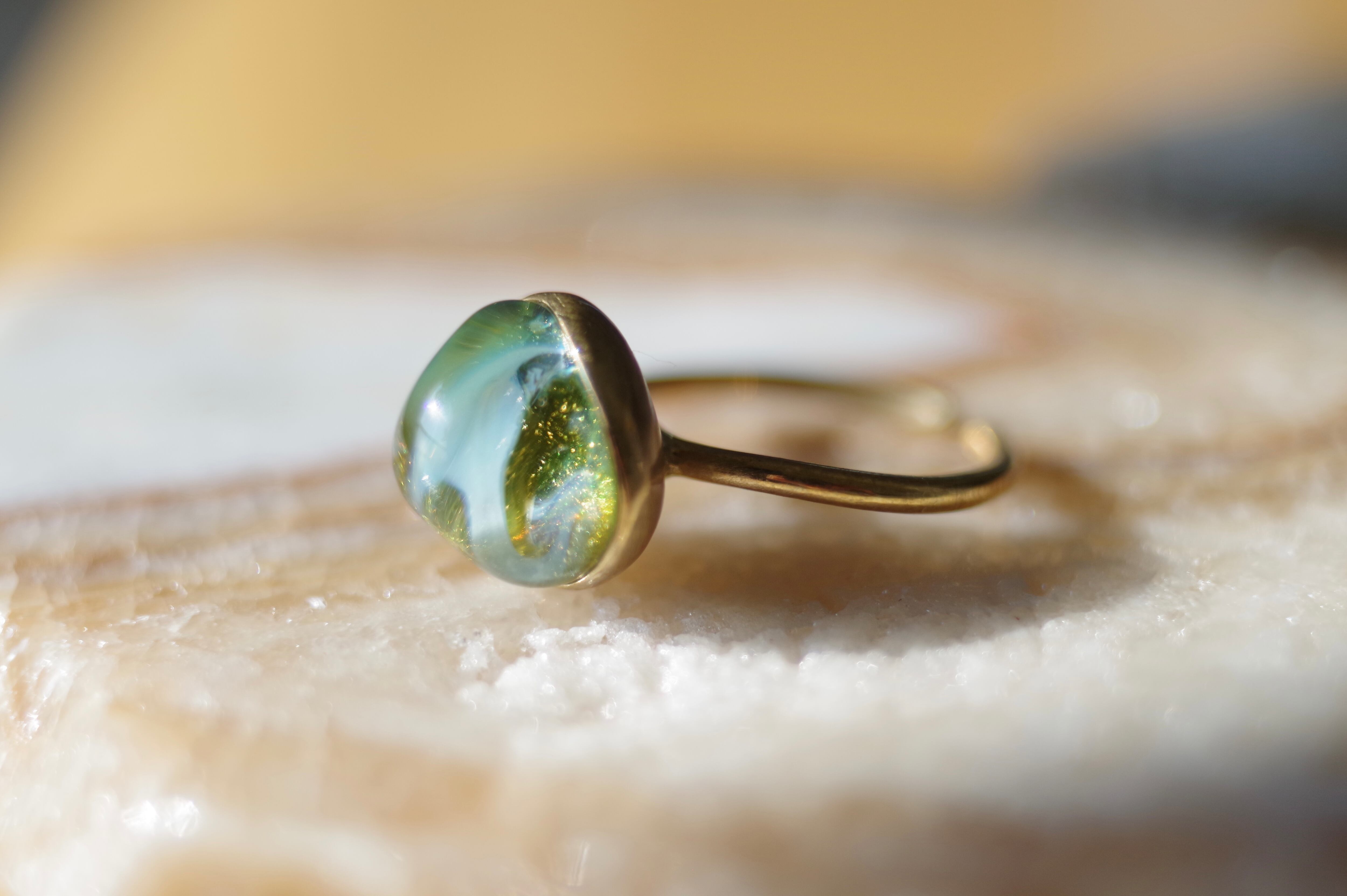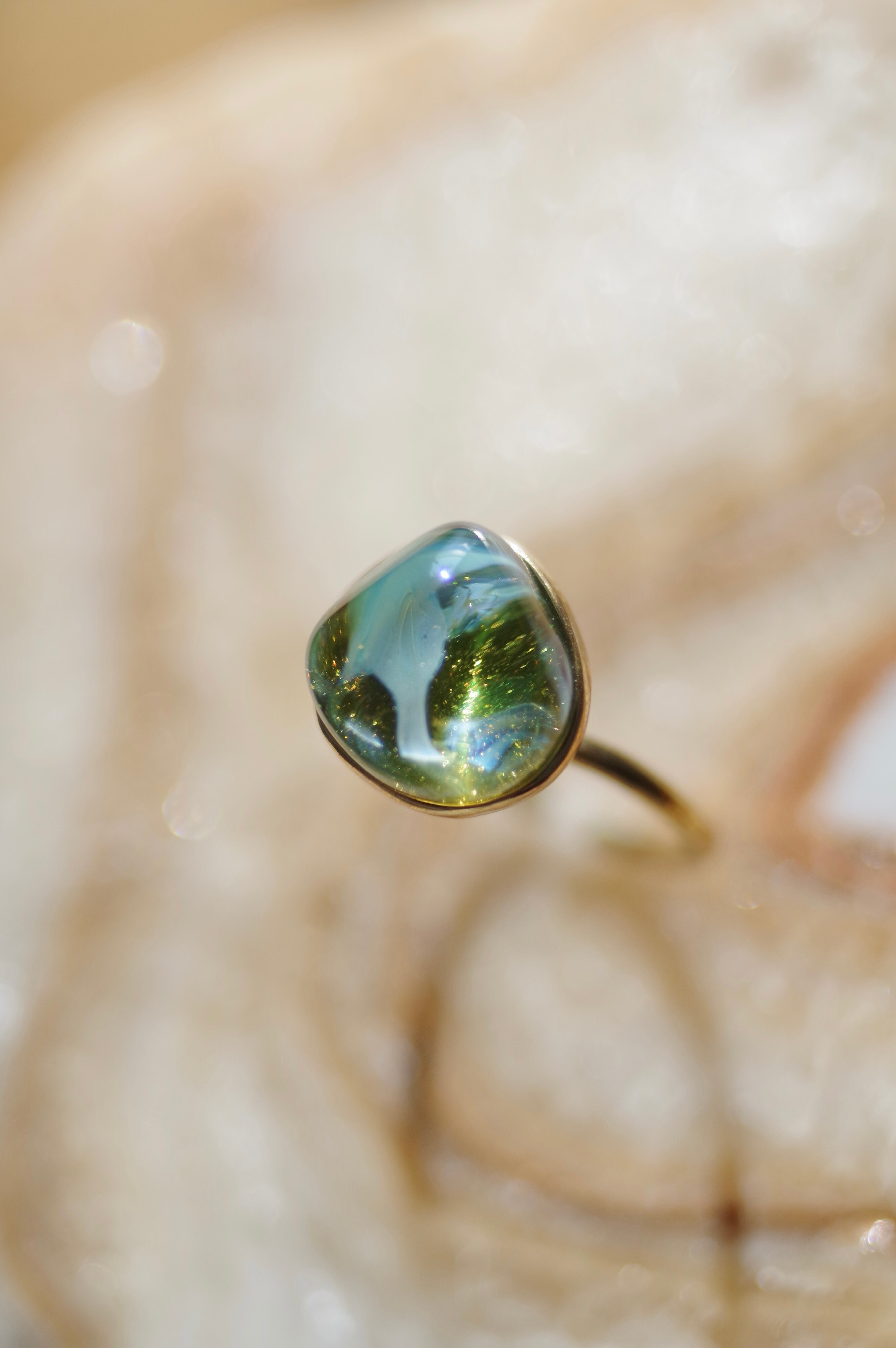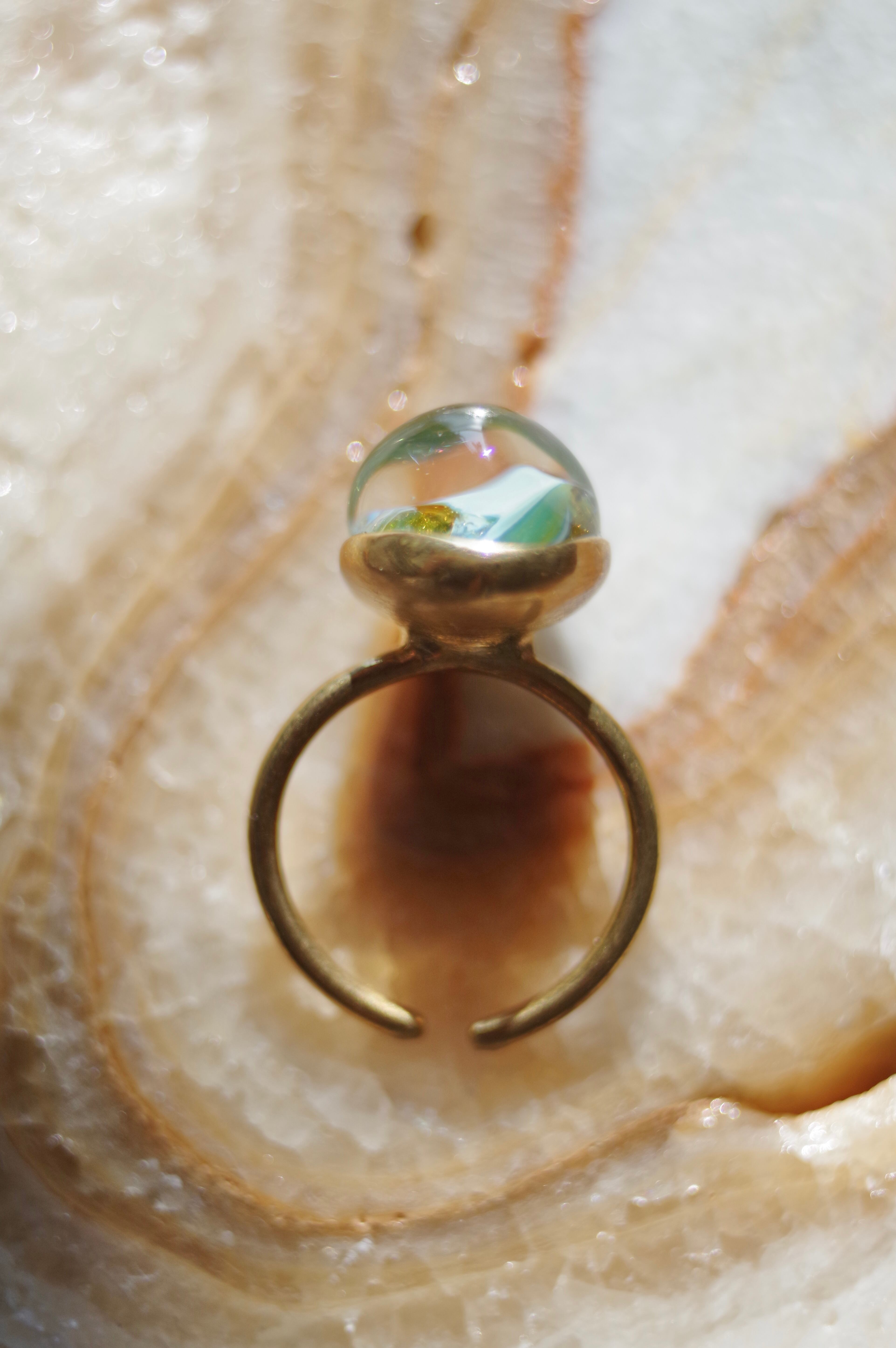 安らかな吐息 11号〜フリーサイズ(こちらで大きくすることは可能です、ご注文の際に希望のサイズをお知らせください) 素材 ボロシリケイトガラス 真鍮 ガラス石の大きさ 約12mm×13mm×10mm リング幅 約1.7mm