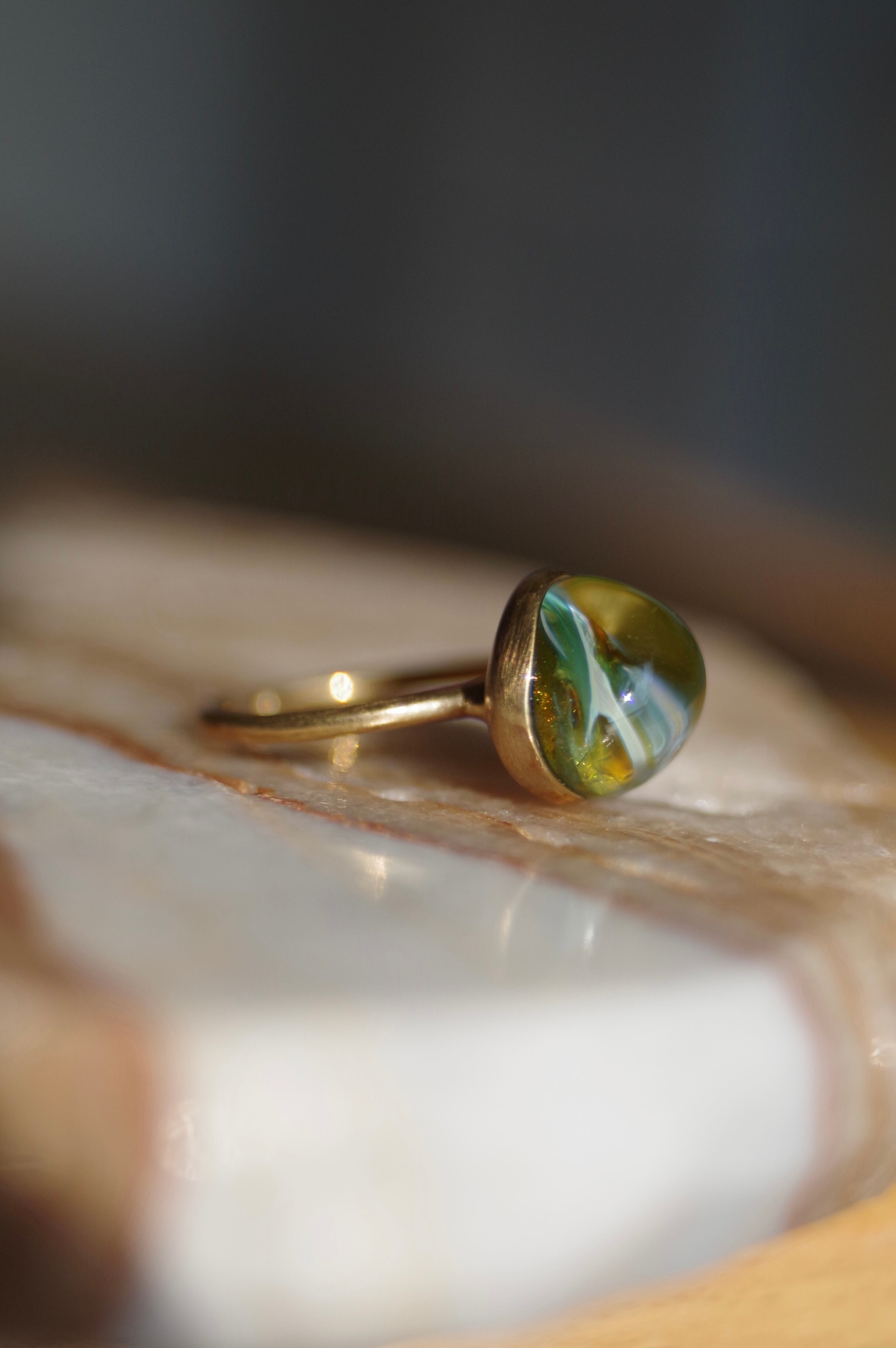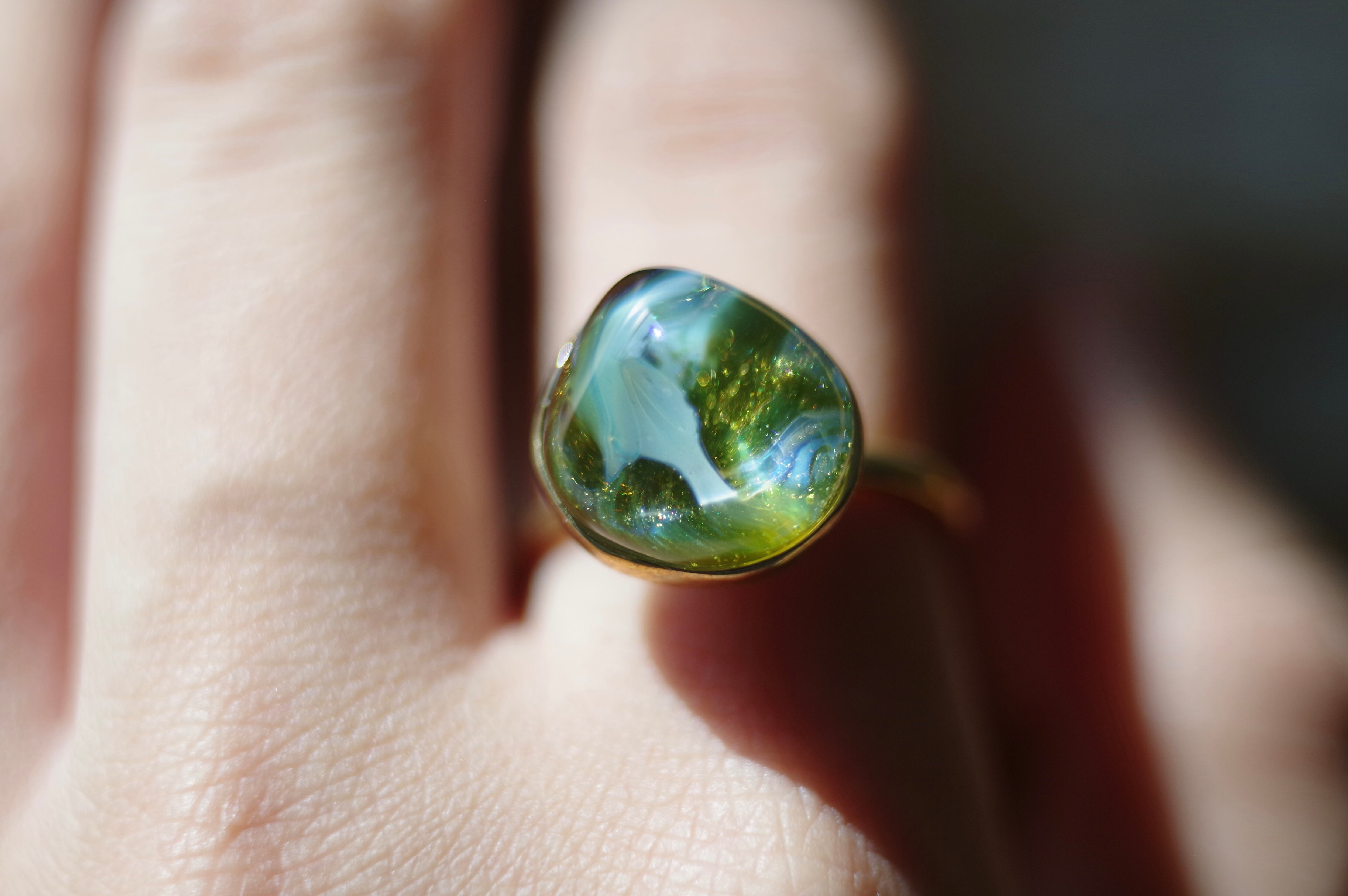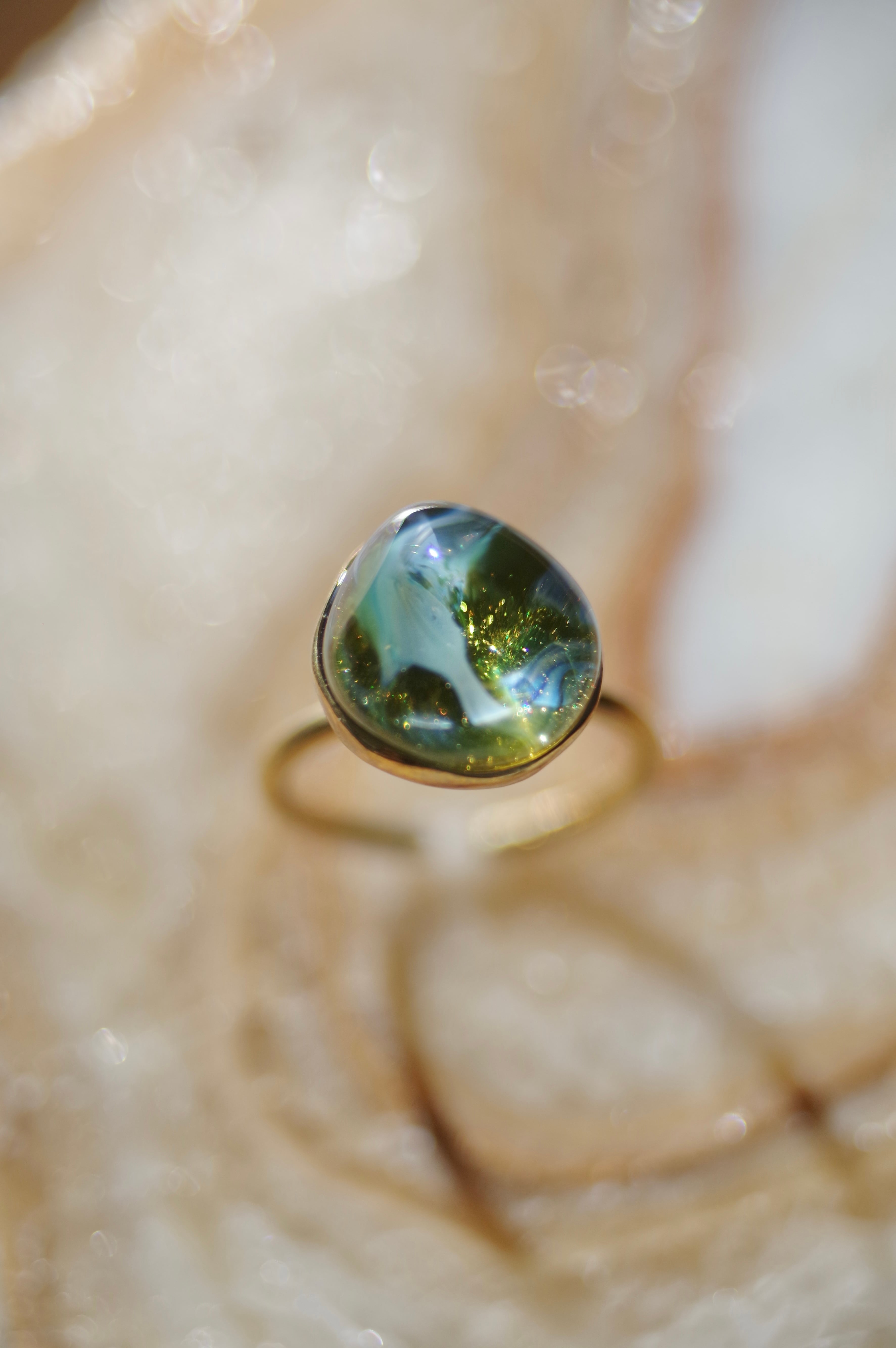 安らかな吐息 11号〜フリーサイズ(こちらで大きくすることは可能です、ご注文の際に希望のサイズをお知らせください) 素材 ボロシリケイトガラス 真鍮 ガラス石の大きさ 約12mm×13mm×10mm リング幅 約1.7mm